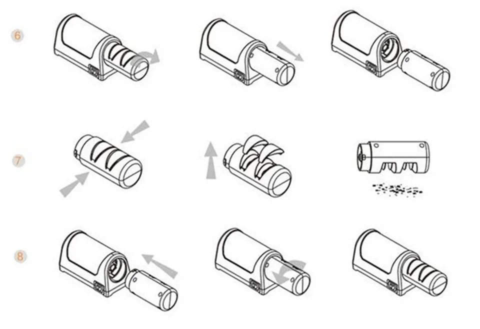 Три минуты и восемь ножей заточены, разрезают лист бумаги на весу. Четыре ножа керамические. На одном было два скола примерно по 1 мм. Провел один раз в прорезях для грубой заточки и один раз в прорезях для точной заточки и нож остренький. Точилка классная.