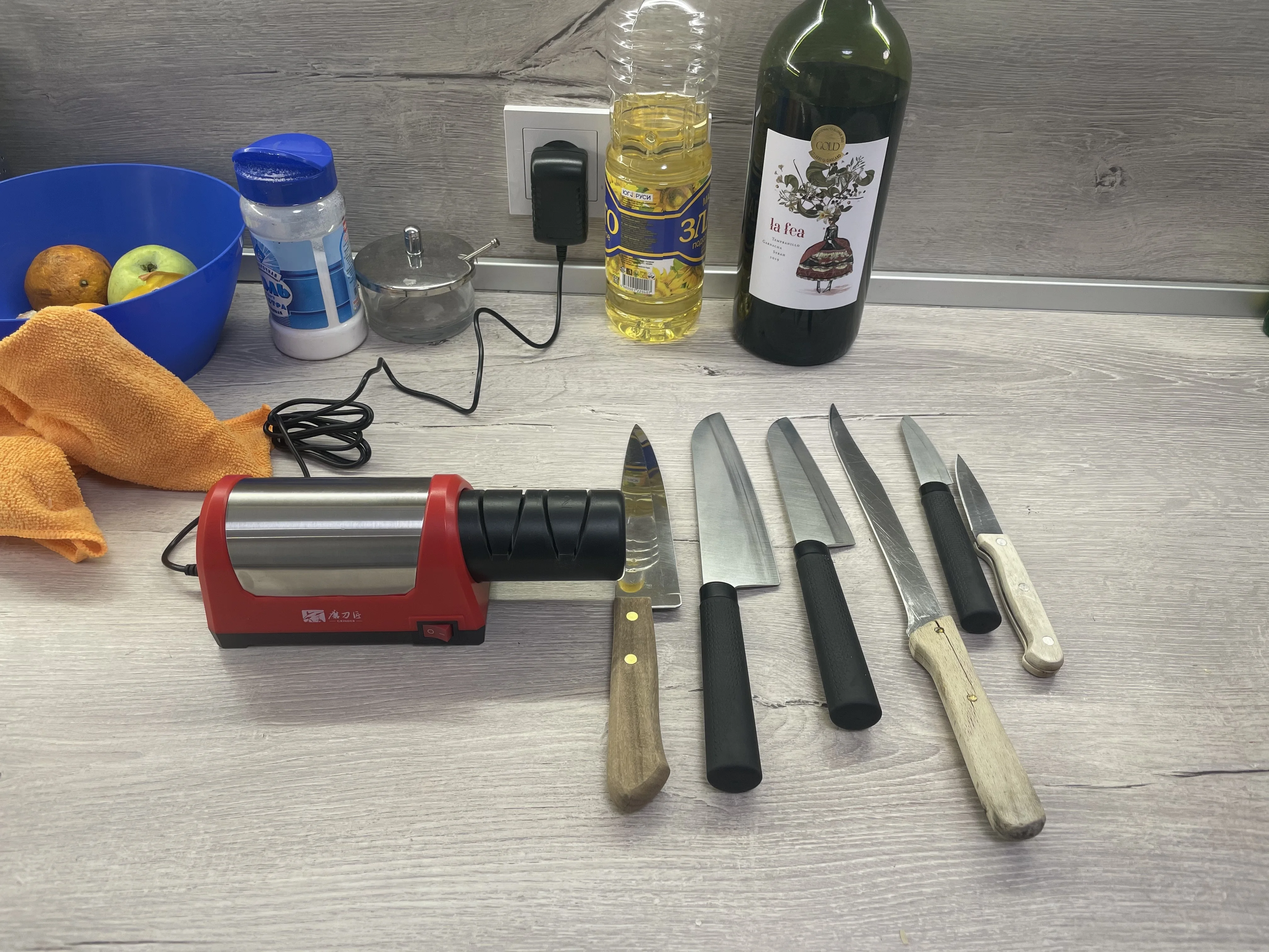 Точит не плохо, не сильно мощный, но для кухни пожалуй сгодится. Сильно большой разницы не заметил от грубой и тонкой заточки. Обе примерно одинаковые .