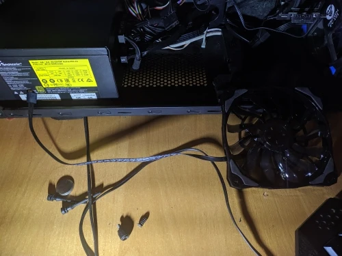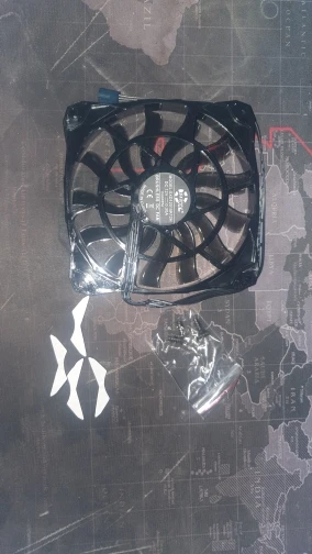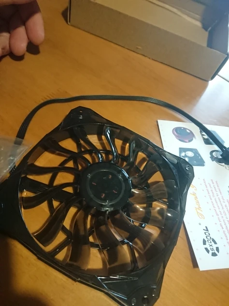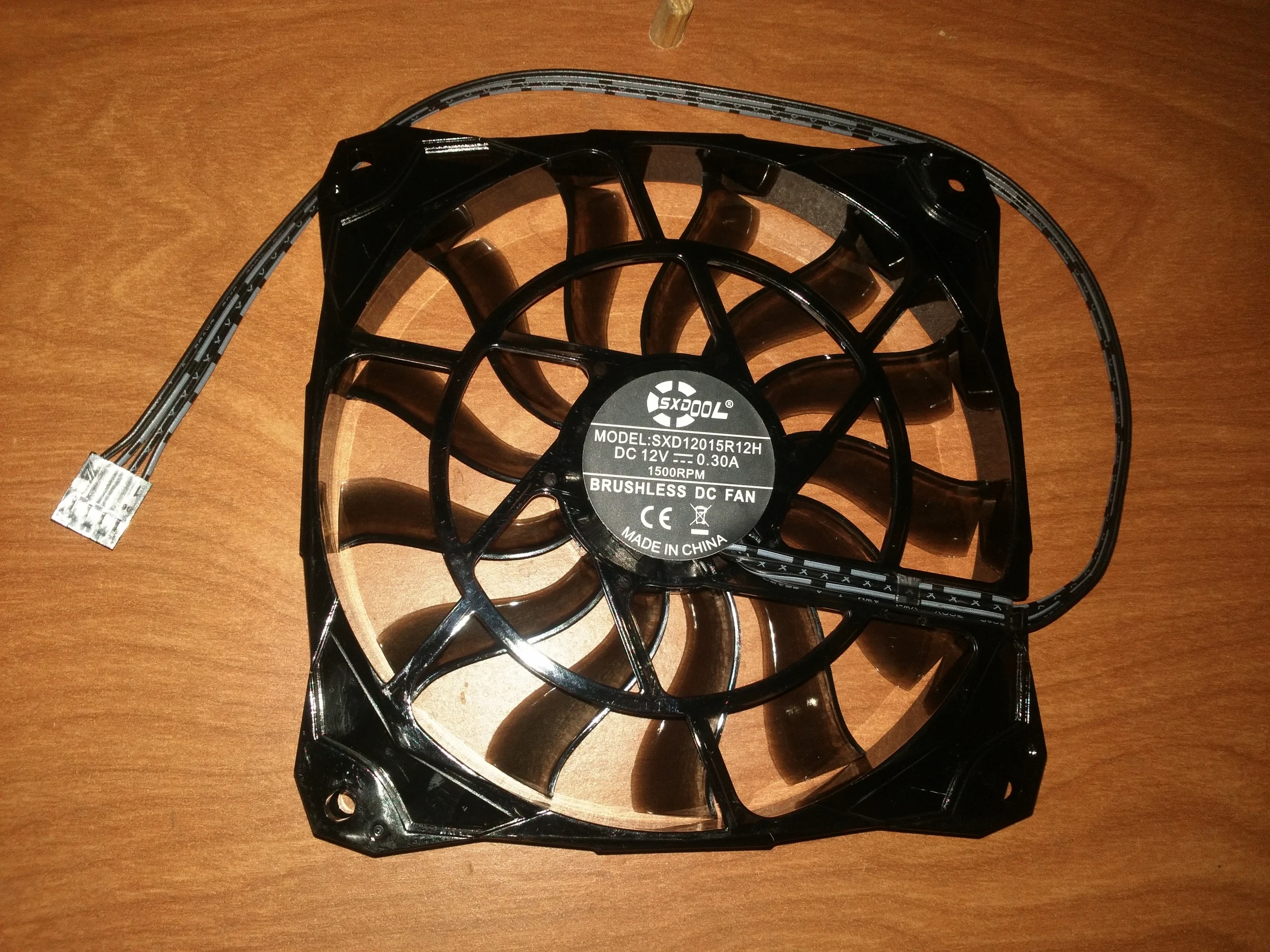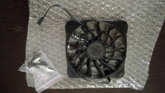 Вентилятор качественный, не шумный. В фирменной упаковке, с шурупами, кабелями, самоклеющимися бамперами. Устанавливался вверху корпуса над радиаторами мосфетов vrm. При скорости около 1200 слышен только воздух. Сначала при установке крыльчатка цеплялась за перфорацию корпуса. Пришлось вырезать подкладки под бамперы.