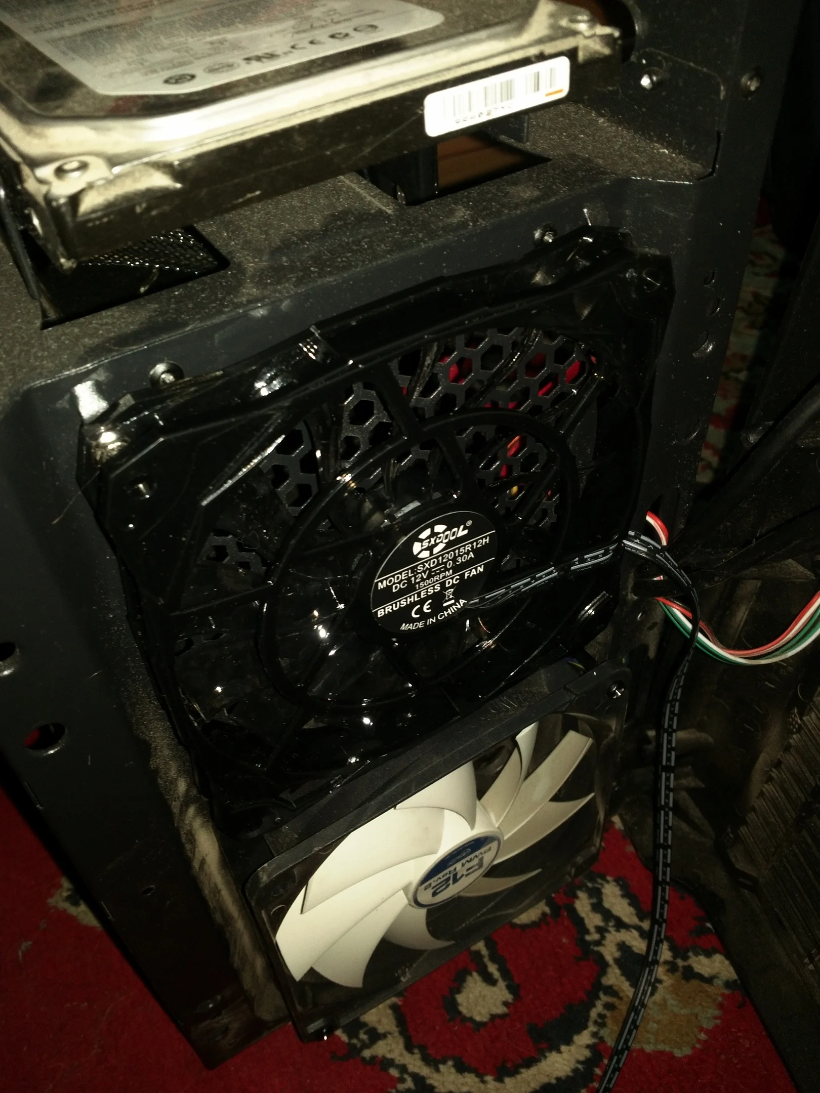 Идеально! Из-за глупого построения корпуса, его проектировщики оставили место под вентилятор, но не учли, что место под вентилятор будет заниматься проводами от usb и кнопок включения. Пришлось искать тонкий вентилятор и подстраивать так, чтобы провода не мешали лопастям. У меня получилось. Сам по себе вентилятор отличный! Поставил его на выдув, так как в этом месте как раз видеокарта нагревает часть корпуса и в дальнейшем перегревается не только она, но и харды. Температура резко упала, что не может не радовать. Получилось так, что нижний вентилятор прогоняет холодный воздух взятый снизу, тот проходит через жёсткие диски, втягивается в видеокарту, часть потока идёт влево, часть вправо. То, что попадает справа и вытягивает этот вентилятор наружу.