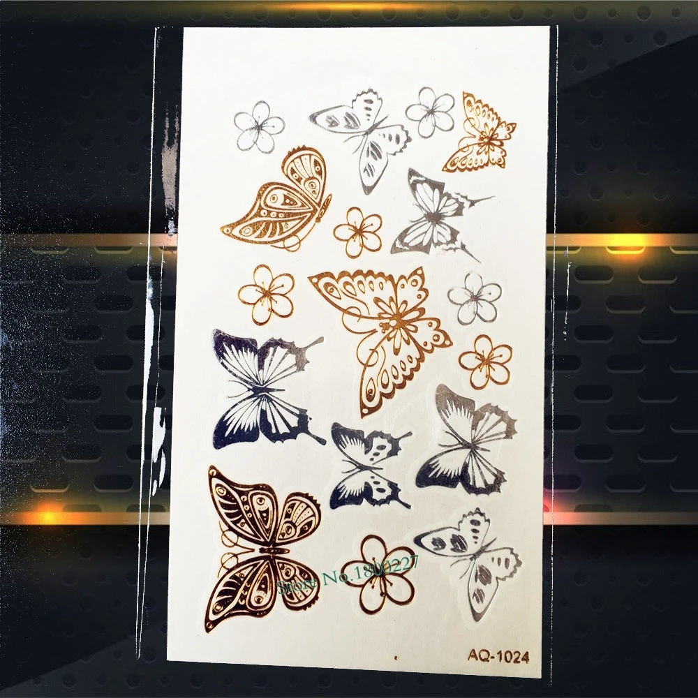 1 шт., золотая металлическая Временная тату-наклейка для девочек, PAQ-1024 для макияжа, поддельная бабочка, тату-паста, золотой цвет, Серебряный цветок, тату