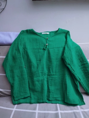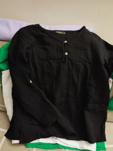 Цвет точно как на фото, размер подошел на 50 российский, длина хорошая, прикрывает причинные места. Материал хлопок, жатка, мне нравится. Заказывала зелёную и чёрную с длинными рукавами и белую без рукавов. Проймы в белой огромные, не пойму, почему фабрика не в состоянии купить хорошие лекала. Хотя пошив не фабричный, носить пойдёт конечно на каждый день, но не айс. Рукава не подкатываются, узкие. Можно только приподнять на 3/4, но подвернуть не получится. Хотя пуговка и ленточка пришиты. Они чуть свободнее запястий внизу. 5 звёзд за материал. Но белую придётся перешивать в проймах. А хотелось бы, купил, одел и пошел. Хотя зеленая и черная нормально смотрятся в общем. Но 4хл на обычный 1 хл пойдёт. Берите на 3 размера больше. Посылка шла 63 дня, долговато. Но в целом покупкой довольна, нравится ткань на этих блузках. Спасибо. Может закажу в других цветах с длинными рукавами и платной доставкой, чтобы быстрее
