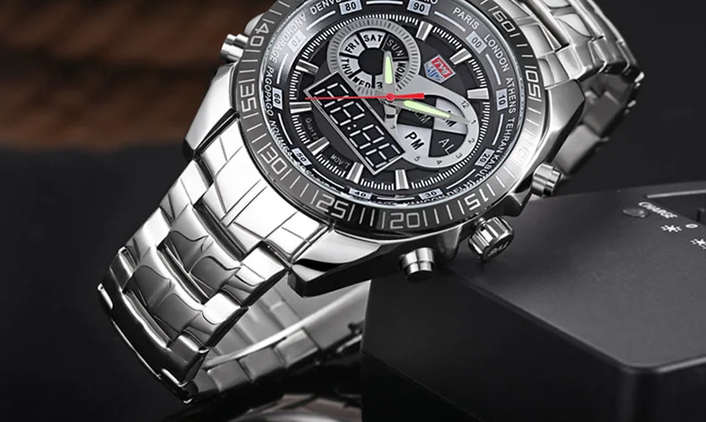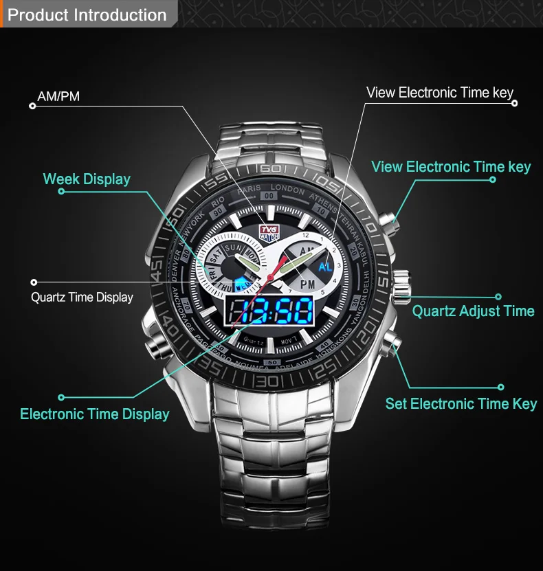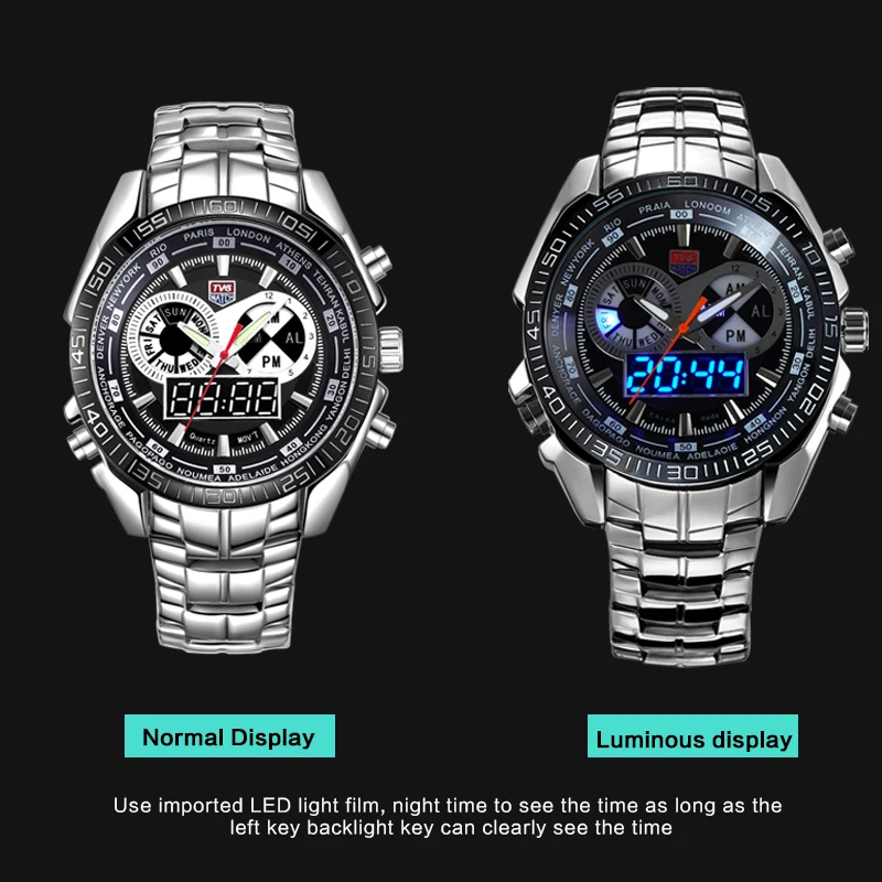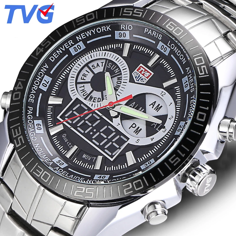 Часы наручные мужские Кварцевые водонепроницаемые, спортивные брендовые цифровые светодиодные в стиле милитари, с двойным дисплеем, из нержавеющей стали