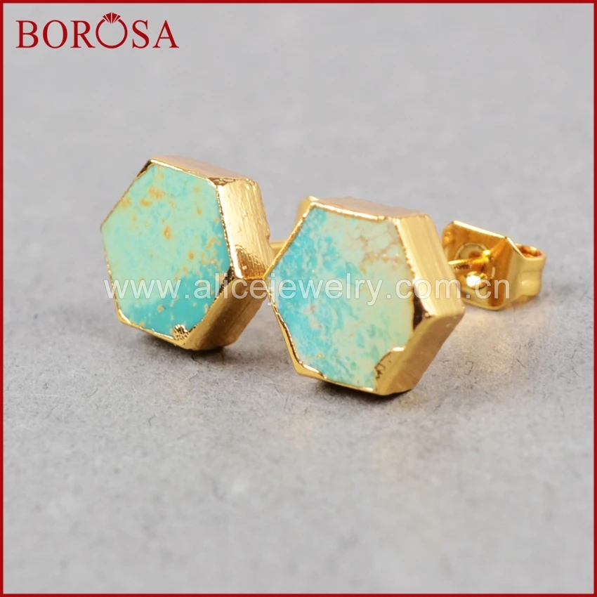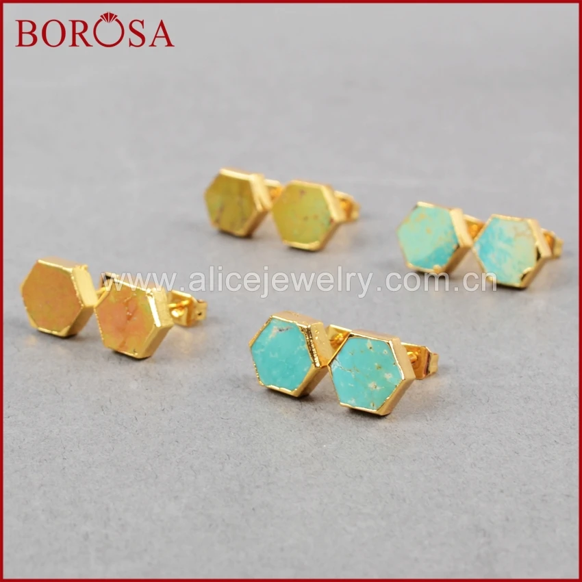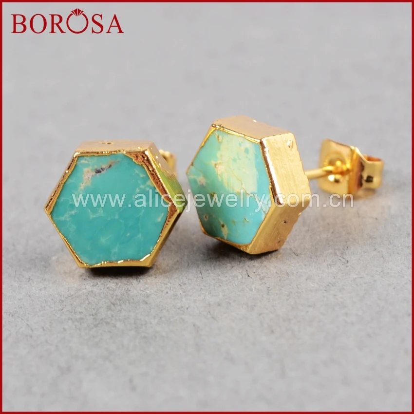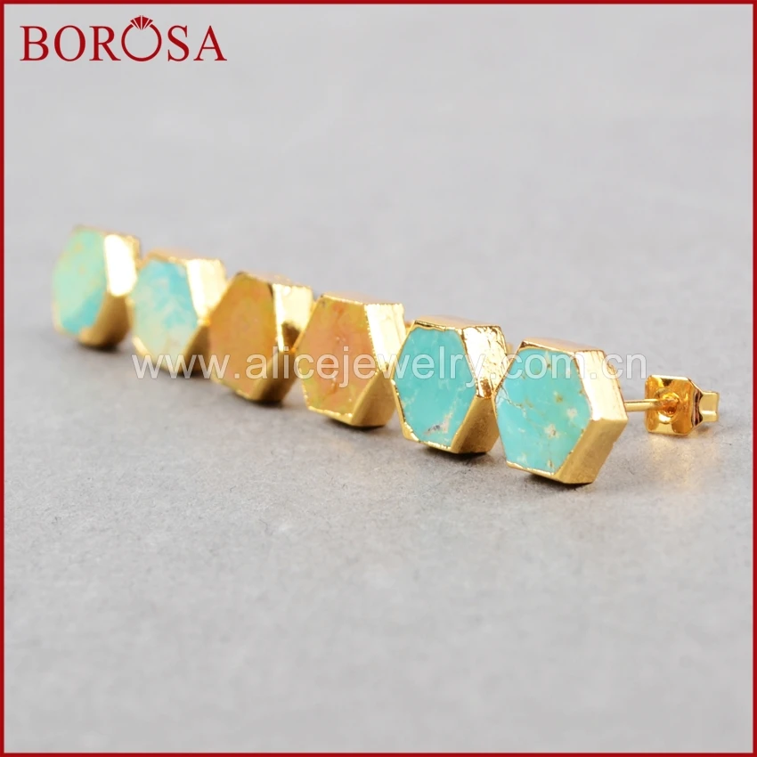Женские серьги-гвоздики BOROSA, 5 пар в форме Шестиугольника, натуральная бирюза, модные серьги с натуральными драгоценными камнями, подарок G0611