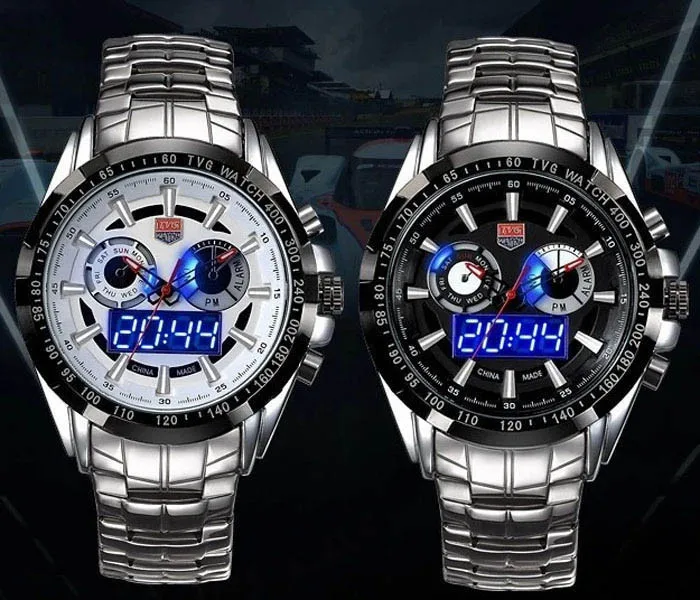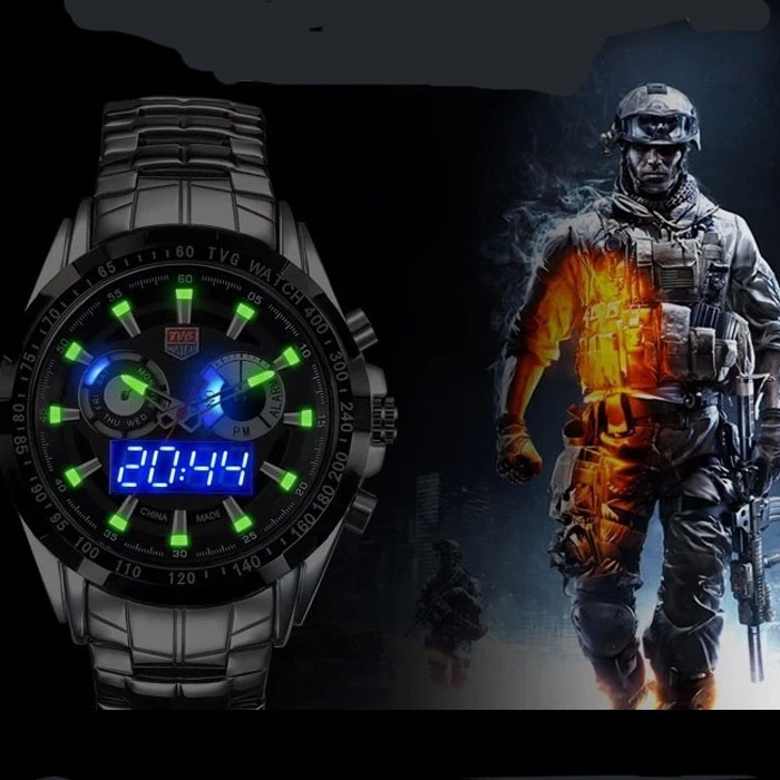 Светодиодные спортивные часы TVG оснащены цифровым механизмом отображения времени. В часах Используется кварцевый механизм, который может гарантировать долговечность и точность времени. Специальная функция водонепроницаемости и нержавеющая сталь подарит удобство вашей жизни так как ее нужно не снимать при мытье рук или лица (но не для купания или дайвинга). Будет хорошим подарком для вас и вашего возлюбленного. А также он будет хорошим спутником жизни. Это хороший выбор для покупки этой моды и практичные, для часов.
