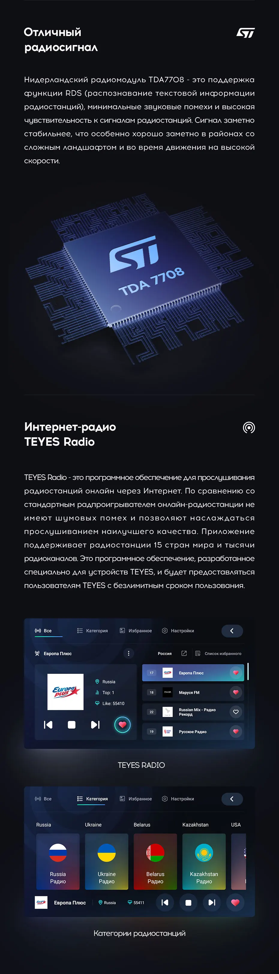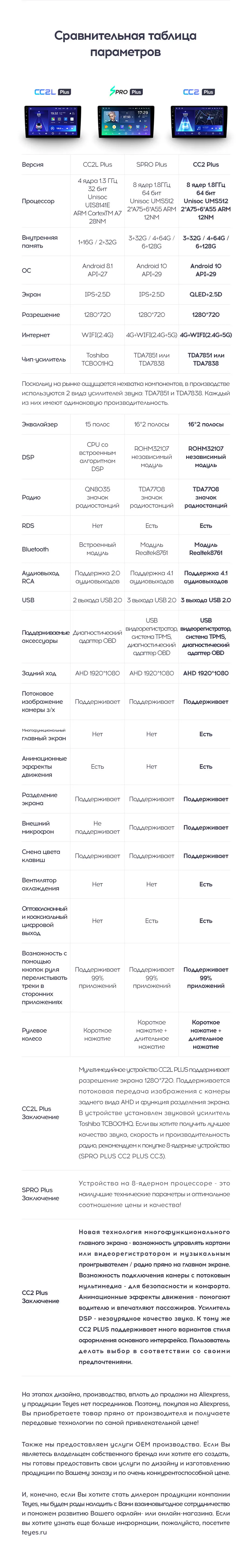 Получил свою магнитолу,до Питера дошла быстро,всего за 15 дней,курьером до двери. Комплектность соответствует полностью,в целом всё выглядит добротно и качественно. Работоспособность пока не проверял. Вообще,я заказывал и оплачивал модель СС2 2+32,но прислали почему-то СС2Plus 3+32,а там соответственно и экран получше,память ОЗУ побольше и камера 1080,а не 720,и ещё другие доп.функции присутствуют. Не знаю,с чем связана такая щедрость,наверное СС2 уже сняты с выпуска и просто закончились. Продавцу большое спасибо! Надеюсь,магнитола будет долго радовать,работая без проблем и поломок;слышал,что именно TEYES-лучшие в этом сегменте...посмотрим ;) Пока ещё ГУ не устанавливал - жду кнопки на руль и задний плафон для камеры. На их фирменном сайте есть видео-пособие по установке для каждой марки авто,и это существенно упрощает задачу. Свои впечатления добавлю после установки.