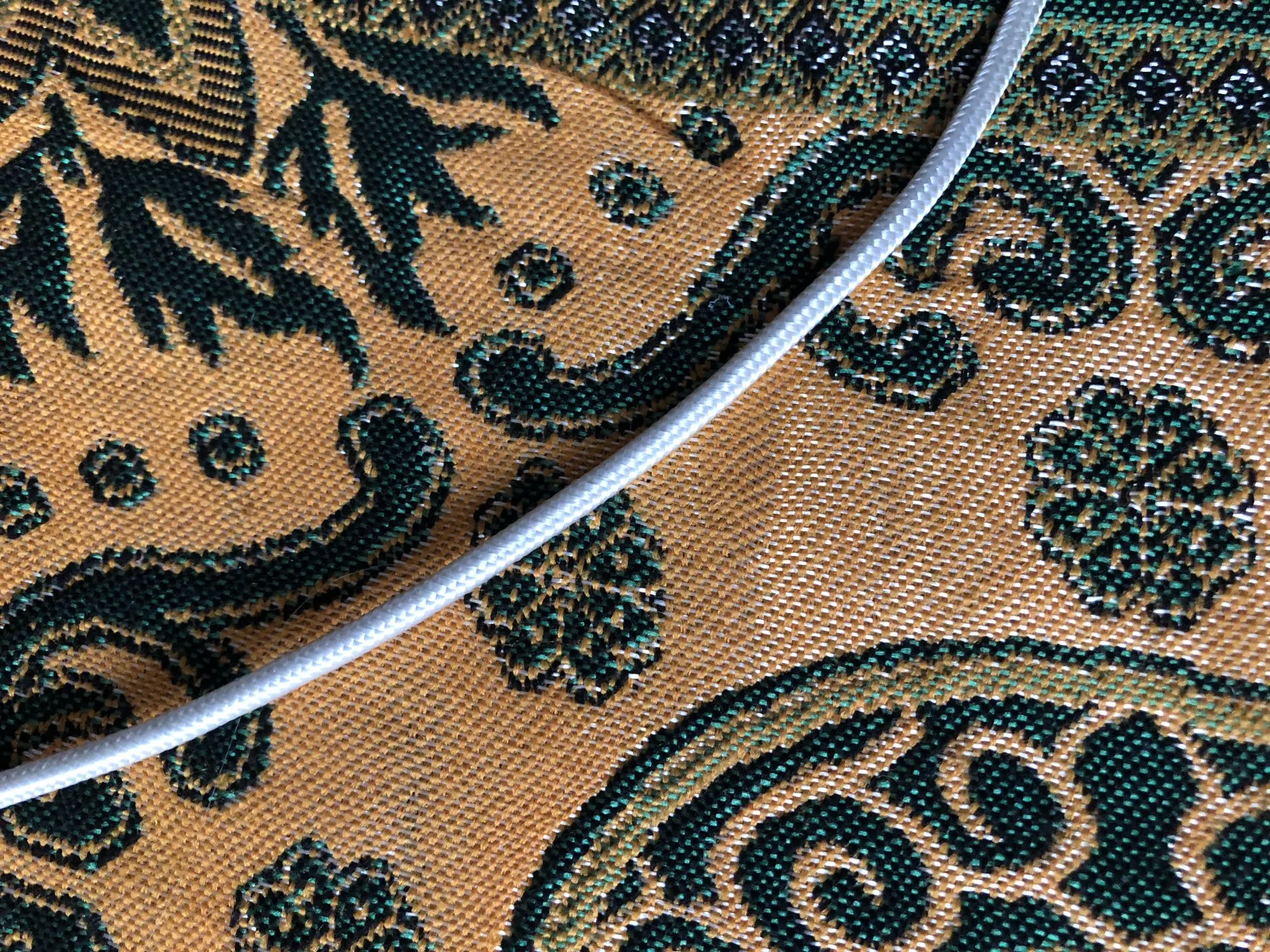 Кабель толстый, будто питание фена. Не шибко гибок, на ощупь будто от ноутбука