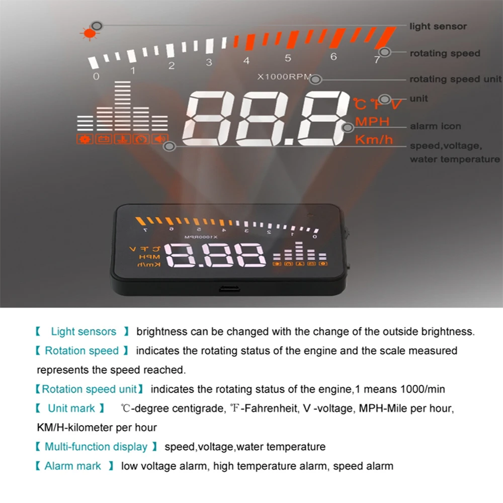 Этот продукт предназначен для водителей Безопасность, особенно при высокоскоростном вождении ночью, HUD может держать водителя в глаза на дороге и может уменьшить автомобильную аварию. HUD может проецировать важную информацию (например, скорость) на лобовое стекло, это может помочь неопытному новичку контролировать свою скорость и избежать нарушения скорости в скоростной дороге. Что еще более важно, это позволяет водителю мгновенно считывать номер в большом видении и всегда заставлять водителей следить за дорогой в ясном уме.