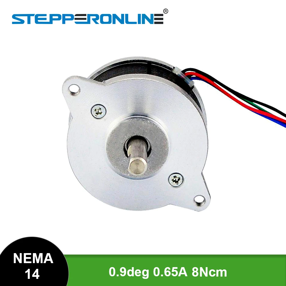 Этот круглый Гибридный биполярный шаговый двигатель Nema 14 с углом шага 0,9 град и размером 36x20 мм. Имеет 4 провода, каждая фаза вытягивает 0,65 А при 4,6 В, С удерживающим моментом 8 нсм (11,33 унций).