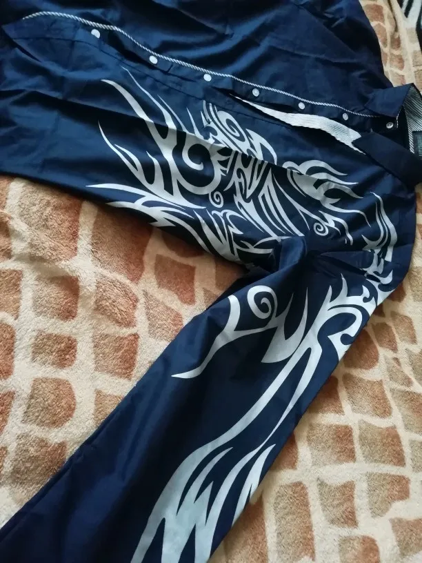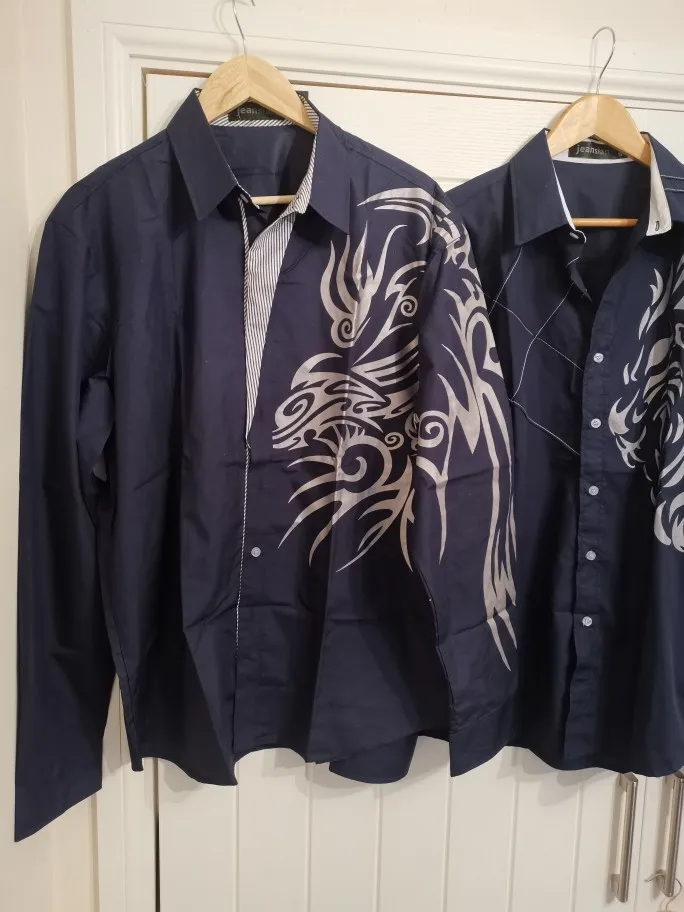 Темно-синяя рубашка с тату Детали с серебристым принтом Проверьте основные характеристики воротника, планки и манжеты Для мужчин 187 и 107 кг-Размер 2XL-идеально подходит Очень красивая рубашка для вечернего выхода. Доставка в срок Отличное обслуж. Отличный продукт Отличный продавец Очень рад. Спасибо.