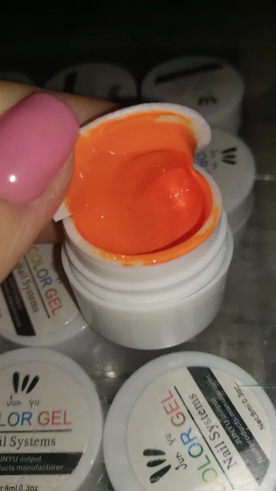 Товар пришёл быстро, спустя неделю после заказа. Все целое, гель не протек. Оранжевых реально тьма:) Гель плотный, в нанесении самовыравнивается, в 2 слоя самое то(у меня в led лампе слой просыхает примерно за 30 сек). Как в носке ещё не смотрела. Заказом довольна