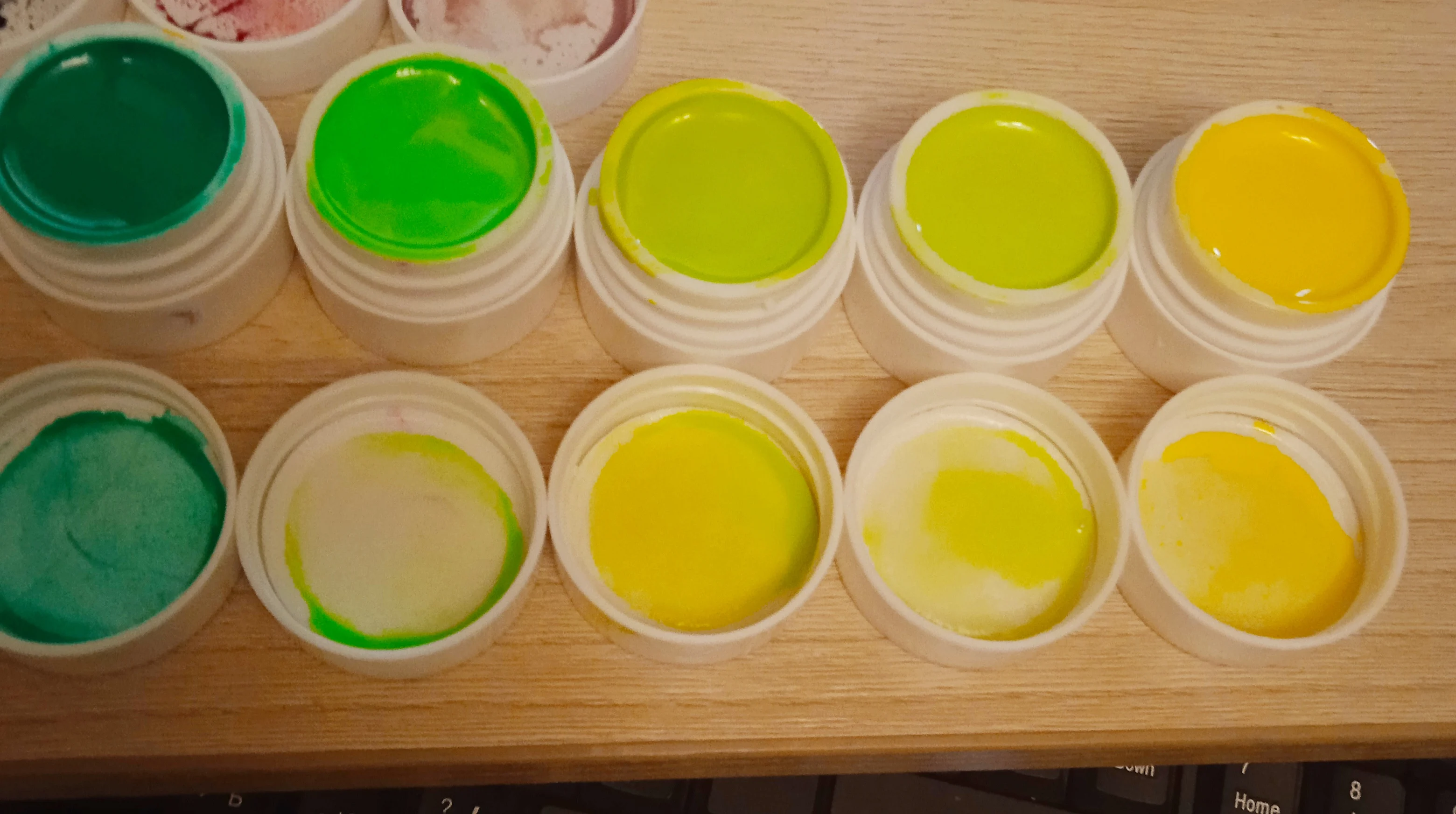 Кольори дуже яскраві. Але чим світліша фарба, тим рідша її консистенція. Деякі кольори дуже схожі. Не вистачає : коричневого, бордового або темного синього . В цілому я задоволена. Дякую продавцю за швидкість доставки. Все прийшло ідеально запаковане . Нічого не протікло. Один маленький нюанс, це те, що кольори нічим не позначені.
