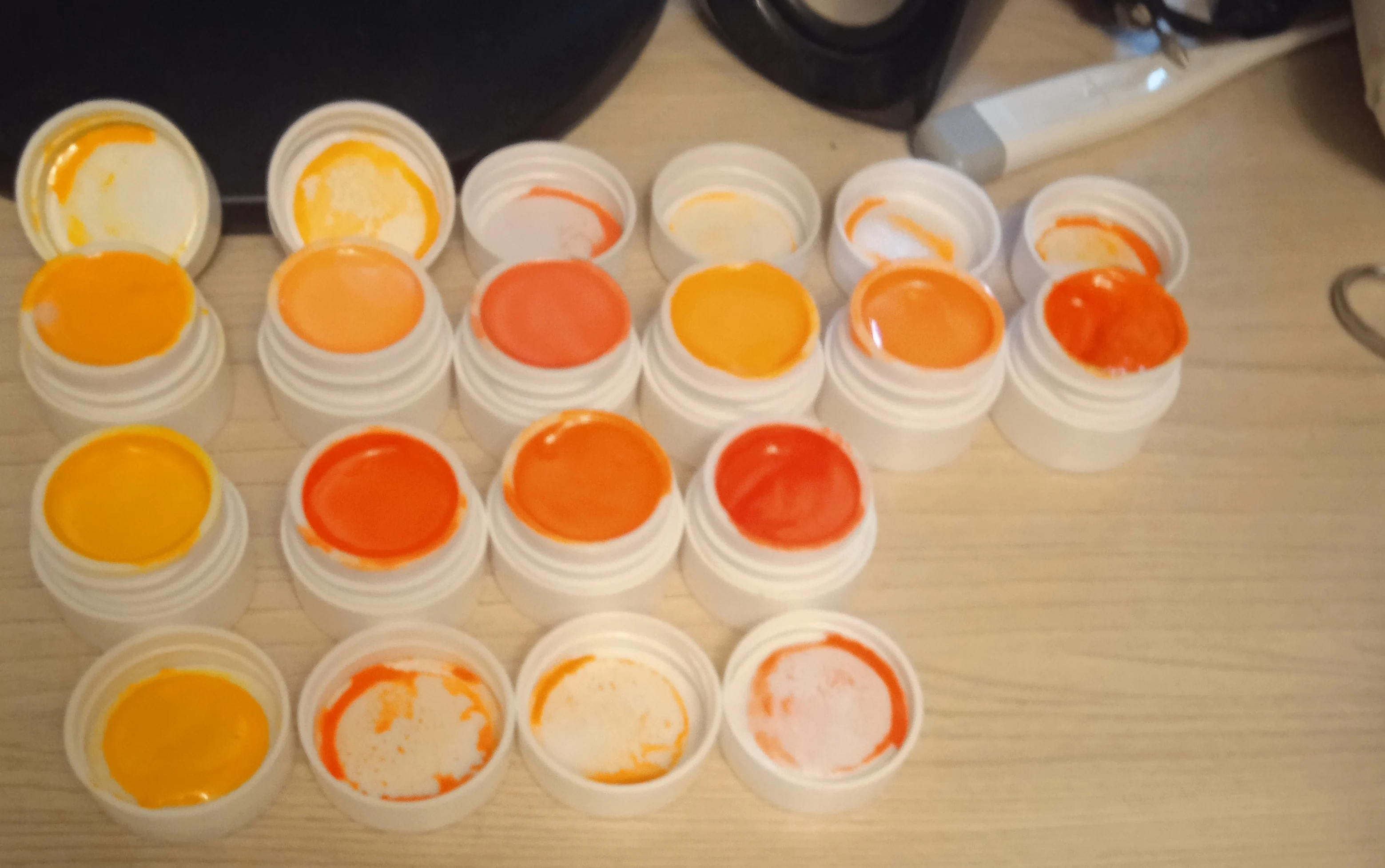 Цвета пришли классные. Много оранжевого. На картинке есть синий и коричневый, а в наборе нет. Один цвет вытек, т.к был открыт.