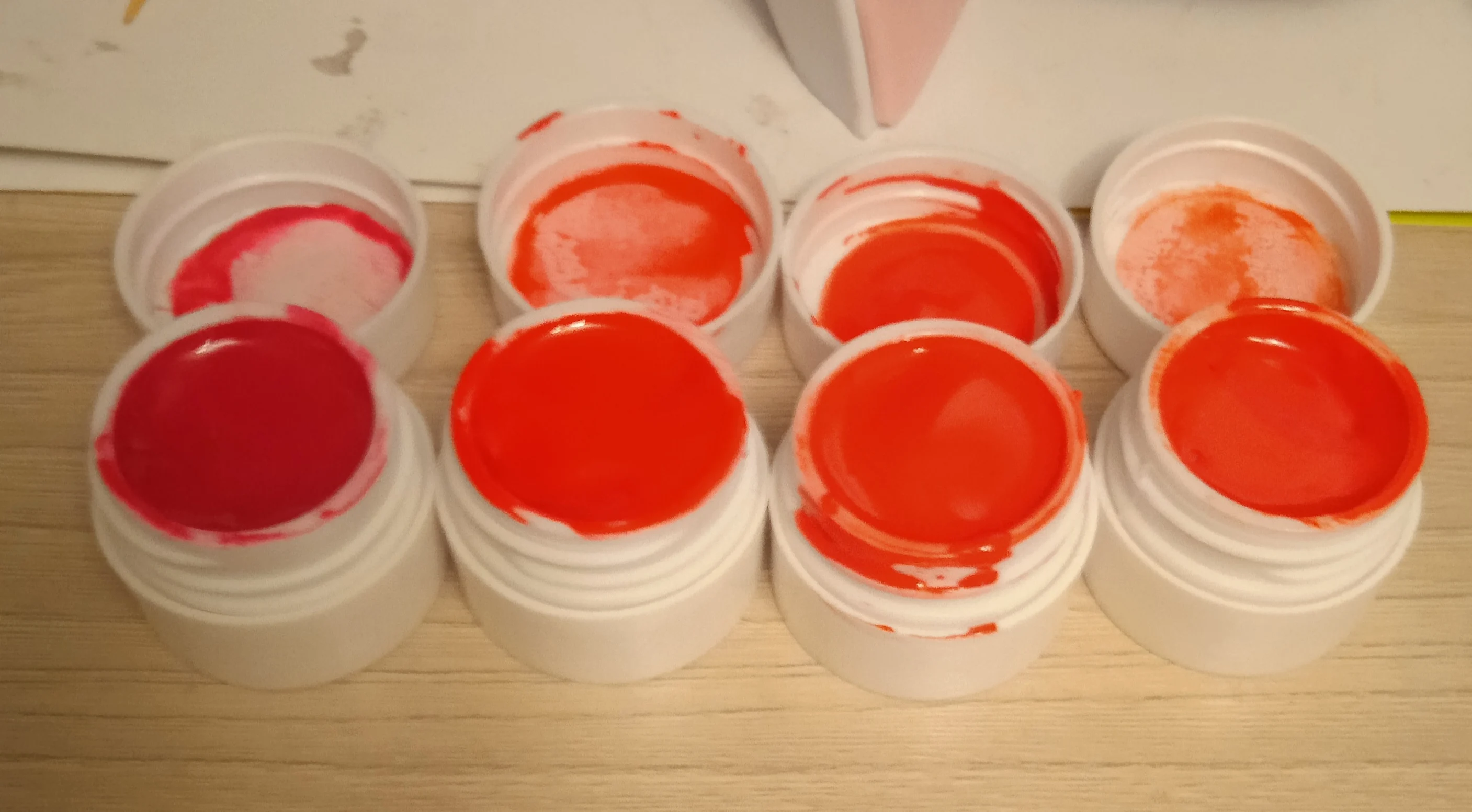 Наконец дождалась. Цвета красивые! Рыженьких -тьма :) Белого жаль нет. Они кажутся целыми, потому, что дно сверху. Краски примерно чайная ложка, это 5 мл. Всё честно. баночки не продуманы, бумажка, которая сверху очень плохо держится. Много красок с испачканной крышкой, измазывается всё при работе с ними. Было бы намного удобней, чтоб краска была хоть на дне, но не пачкала бы крышку в вертикальном положении, чем сделать видимость полной банки. Цена - качество соответствует.