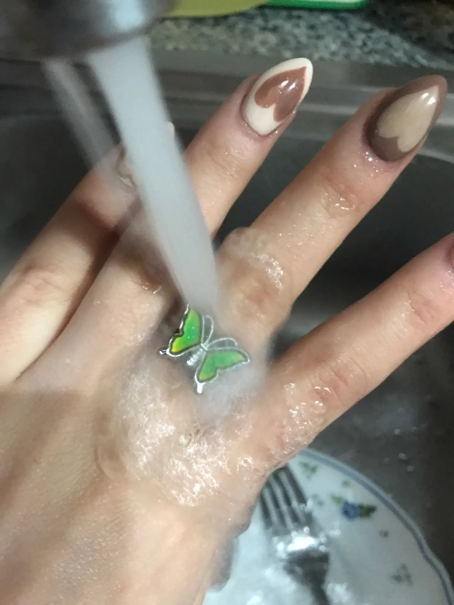 Милое кольцо и мне нравится эта идея, но серебристый металл перевернул медь и через пару дней на моей коже остались зеленые пятна.