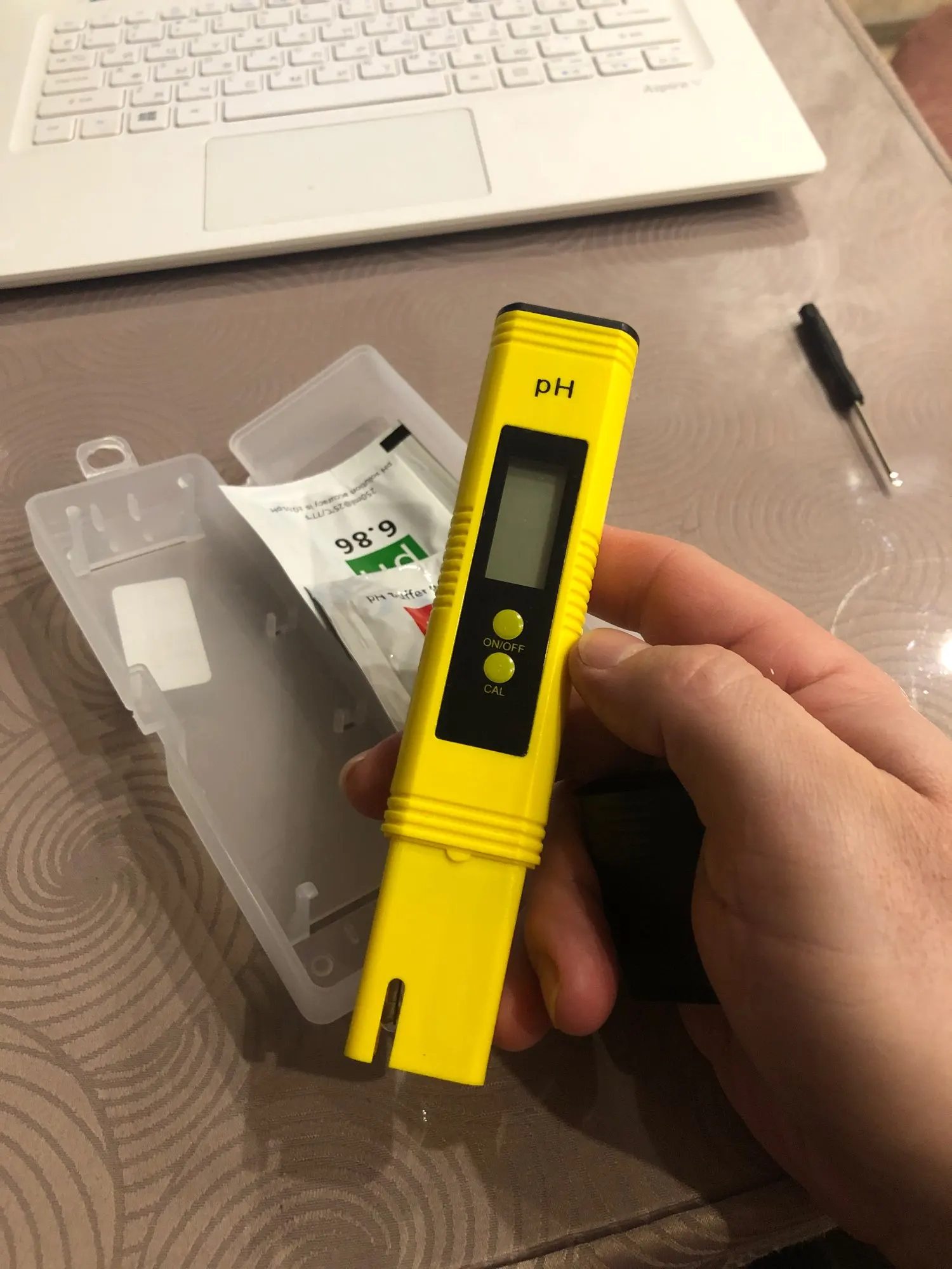 Очень доволен, прибыл в течение 15 дней. Супер быстрая. Устройство, которое я получил, не является точным: оно продвигается на 10 в 10, а не на единицу. Возможно, что я открываю спор после калибровки, если устройство остается неточным (я буду держать в курсе результатов этого спора, если я отправлю его). Поставляется с тем, что делать калибровки (пакет кислоты и основных решений), и инструкции по установке калибровки Браво, это приятно. Поставляется без батарей: предоставляем LR44x2 полярность не указана.