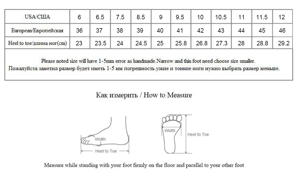 Шаг 1: пожалуйстаИзмерьте свои ногиДлина тщательно.Шаг 2: пожалуйста посмотрите таблицу размеров чтобы выбрать правильный размер по длине вашей стопы. Например, длина стопы230 см, Вы должны выбрать размерUS6.Шаг 3. Если вы не уверены в правильном размере, вы можете нажатьСвяжитесь с нами!