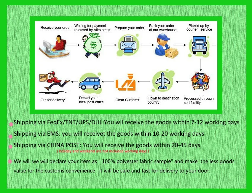 Когда вы размещаете заказ, мы отправим товар в течение 3-4 рабочих дней после завершения оплаты. Мы не гарантируем время доставки на все международные поставки из-за различий в сроках таможенного оформления в отдельных странах, что может повлиять на то, как быстро ваш продукт проверяется. Обратите внимание, что покупатели несут ответственность за все дополнительные таможенные сборы, брокерские сборы, пошлины и налоги на импорт в вашу страну. Эти дополнительные сборы могут быть собраны во время доставки. Мы не возмещаем стоимость доставки за отклоненные поставки. Стоимость доставки не включает налоги на импорт, и покупатели несут ответственность за таможенные пошлины.