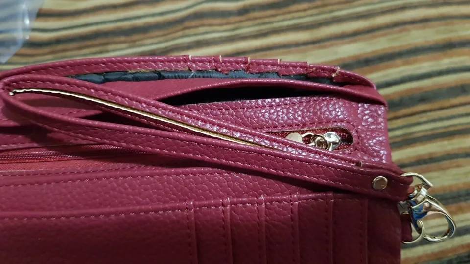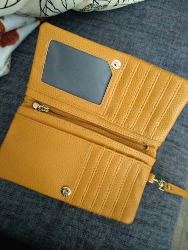 Большой и очень удобный кошелёк, много разных карманов. Сшит вроде аккуратно, но всё портят необработанные внутренние швы. На главной картинке красивый цвет кошелька и другой материал, продавец такие не продаёт. Не стоит потраченных денег.