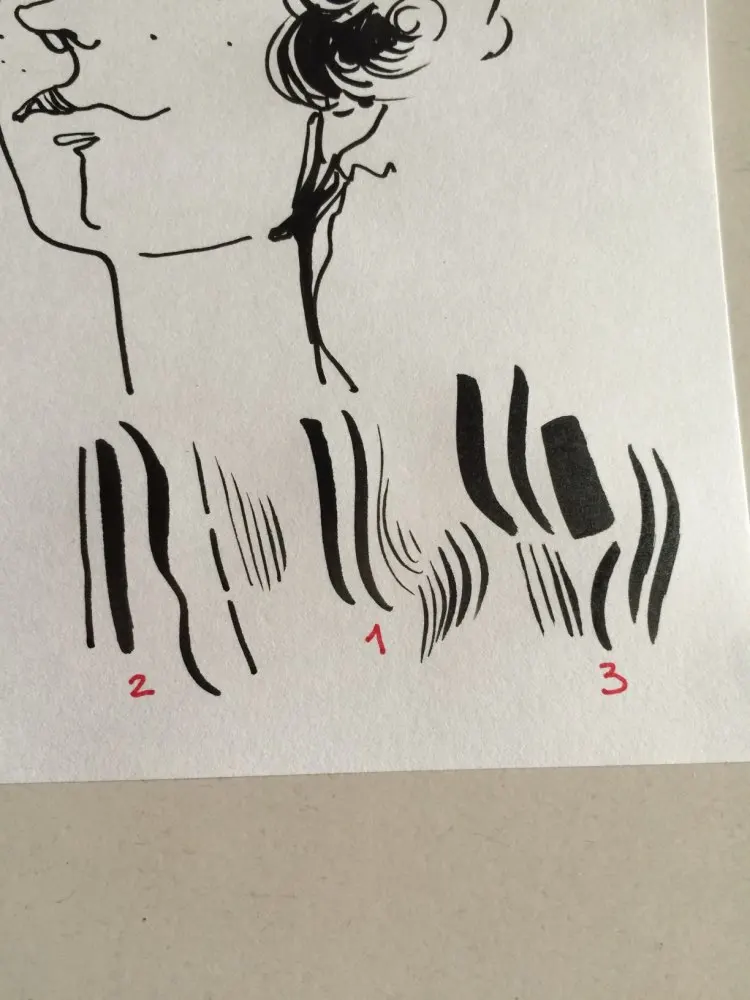 Хороший твердый наконечник, очень легко получить различный ход в зависимости от давления. Очень черные чернила. Не проливается, когда бумага влажная, если не взбудоражило много.