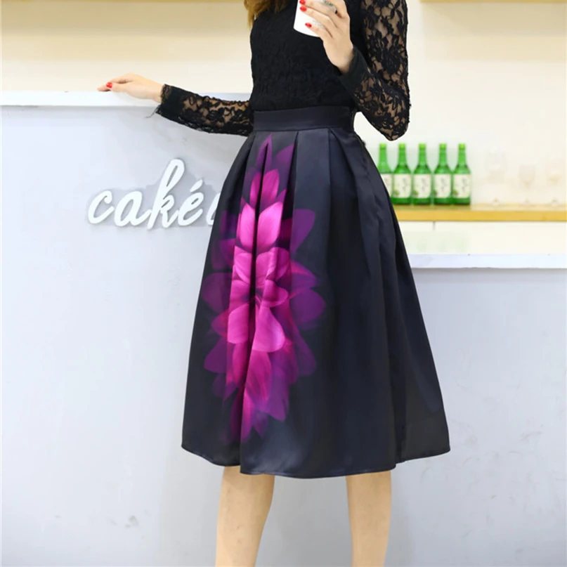 2017 Весна Осень Одри Хепберн винтажная Ретро фантазия фиолетовый цветок цветочный принт Высокая талия плиссированная юбка миди черный Saias