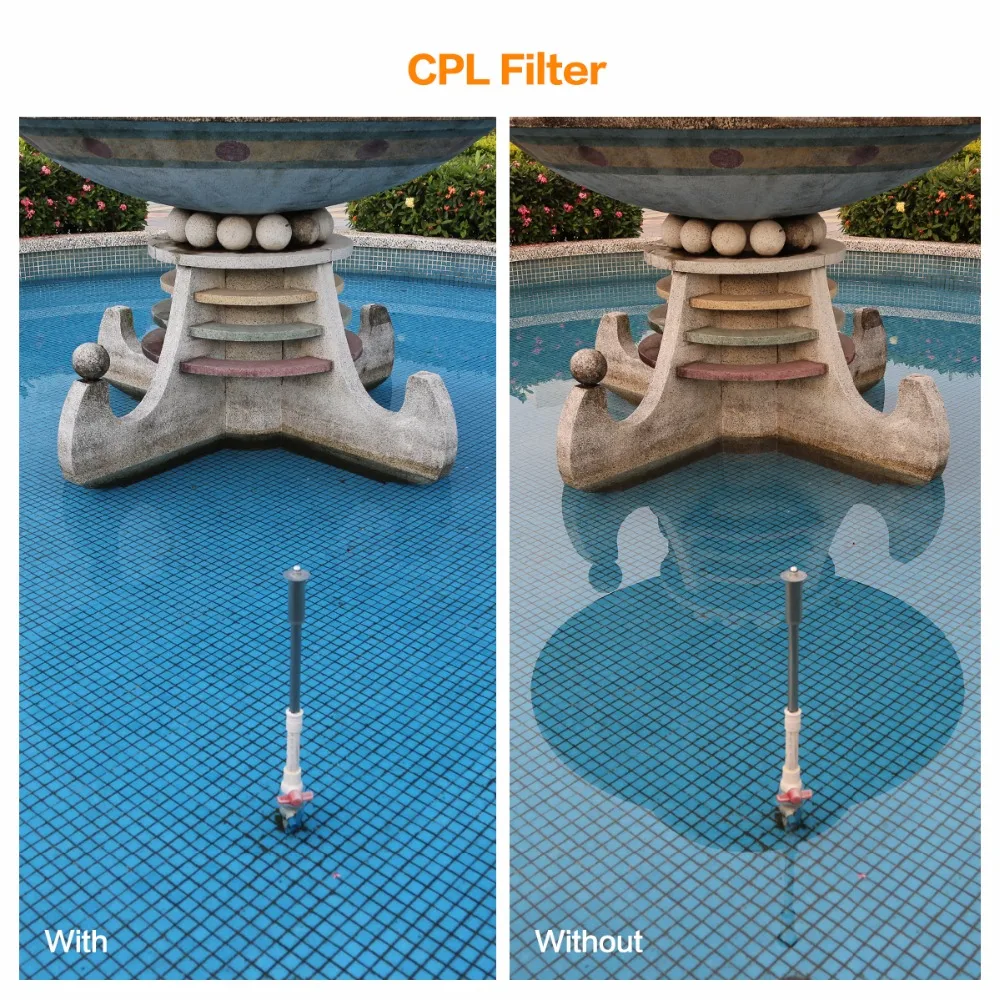 Уменьшите дымку и улучшите Контрастность видео и цифровых изображений, минимизируя количество ультрафиолетового (УФ) светильник. Особенно полезно в областях высокой высоты, снега или пляжа, устраняя нежелательные синие отливки. Импортированное Оптическое стекло, верхний уровень пропусканияCPL (круговой поляризатор) Фильтр