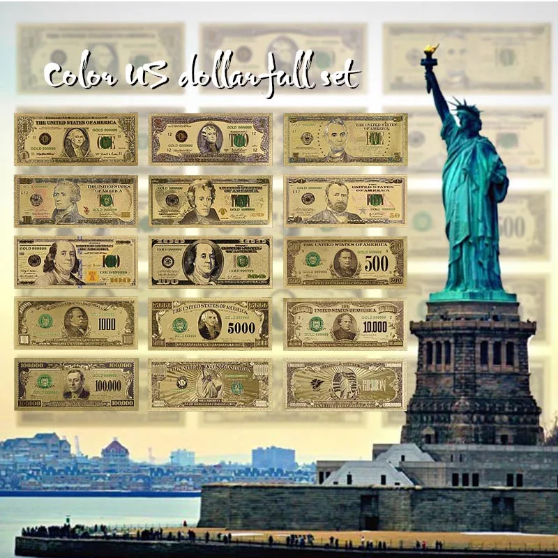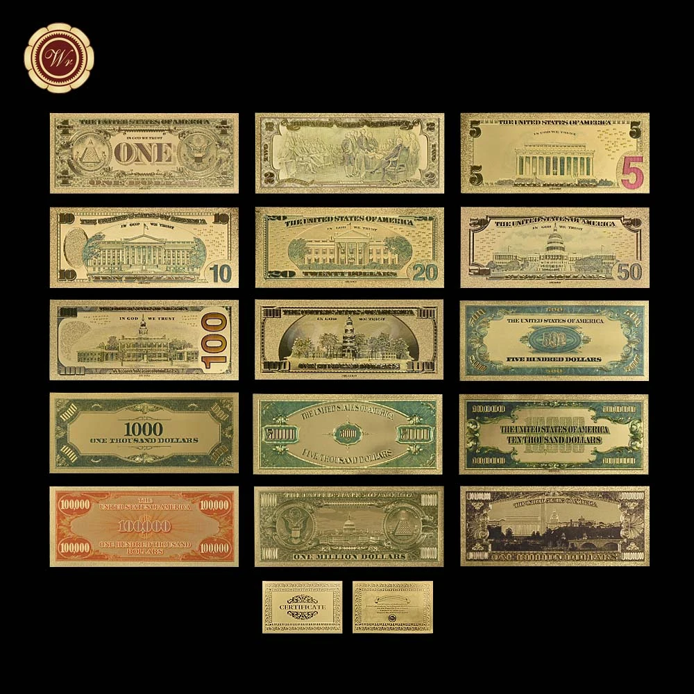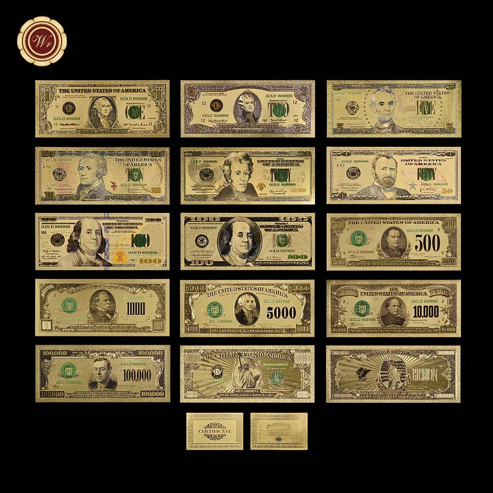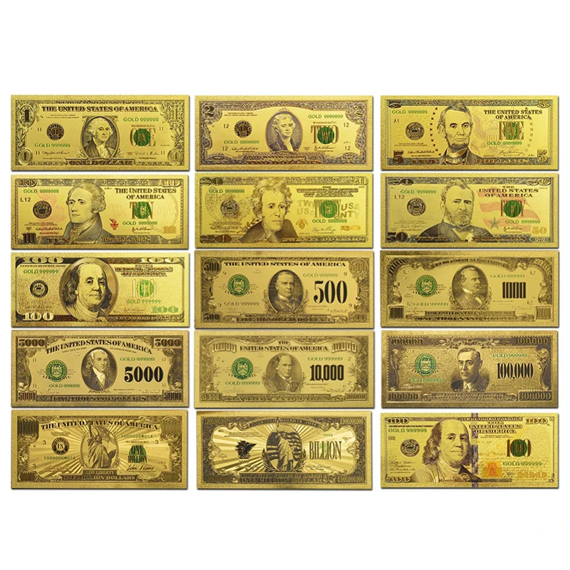 Набор золотых банкнот 1,2,5,10,20,50,100 ,500,1000,5000,10000,100000,1, млн, 1 миллиард долларов США