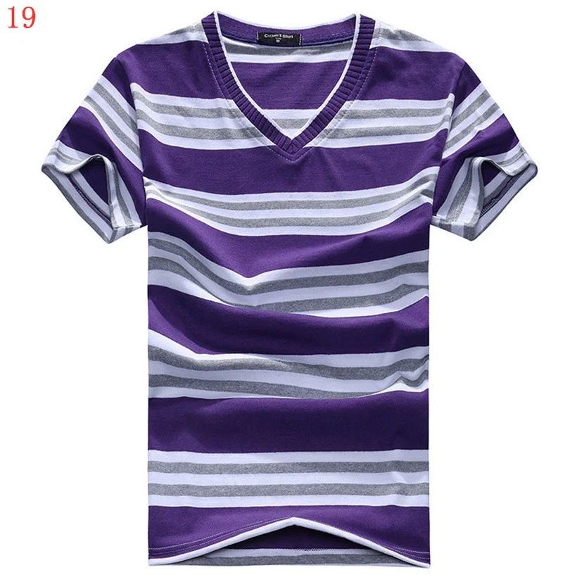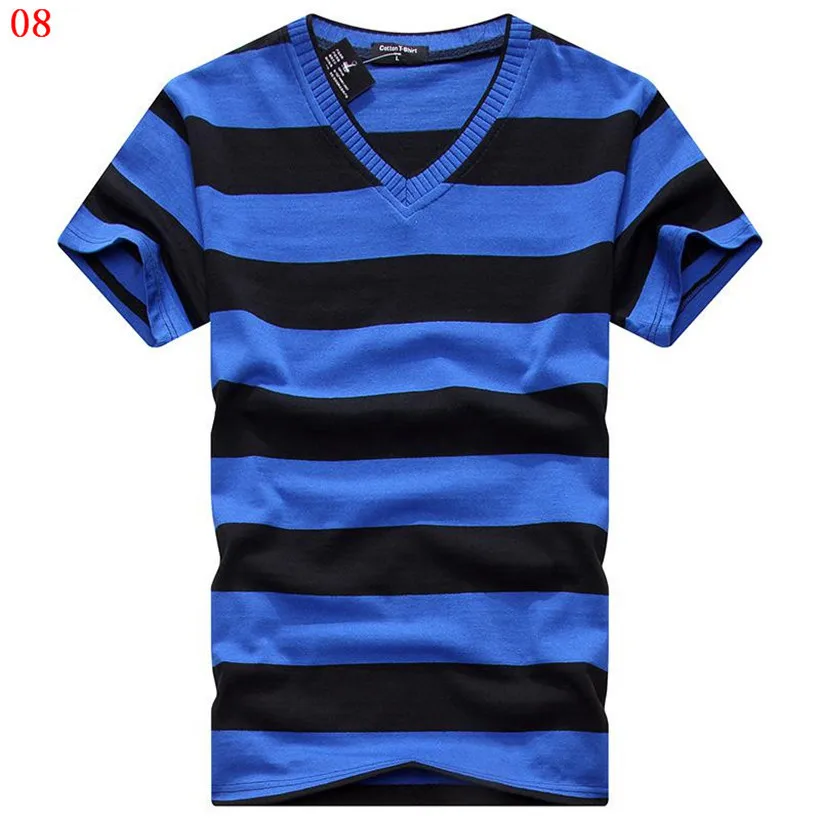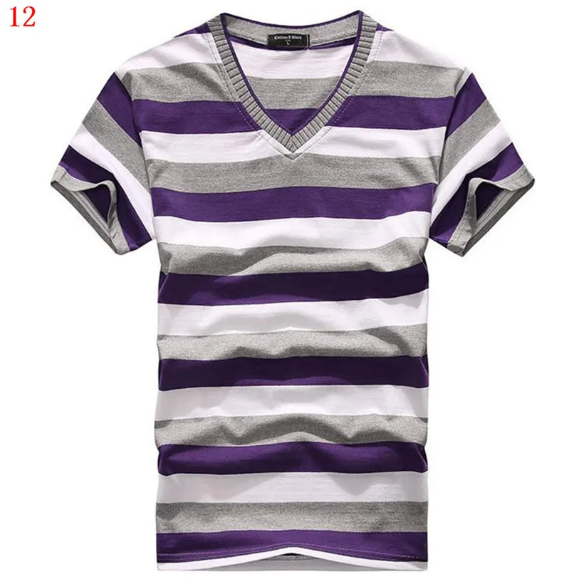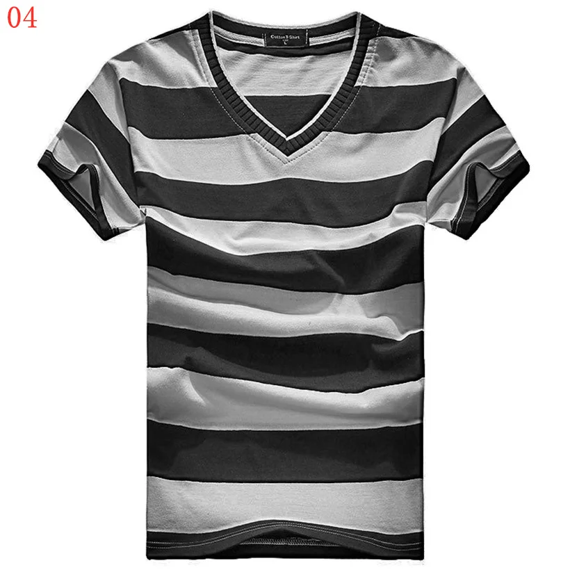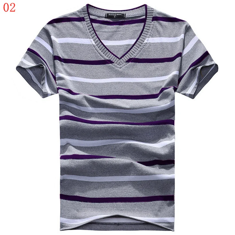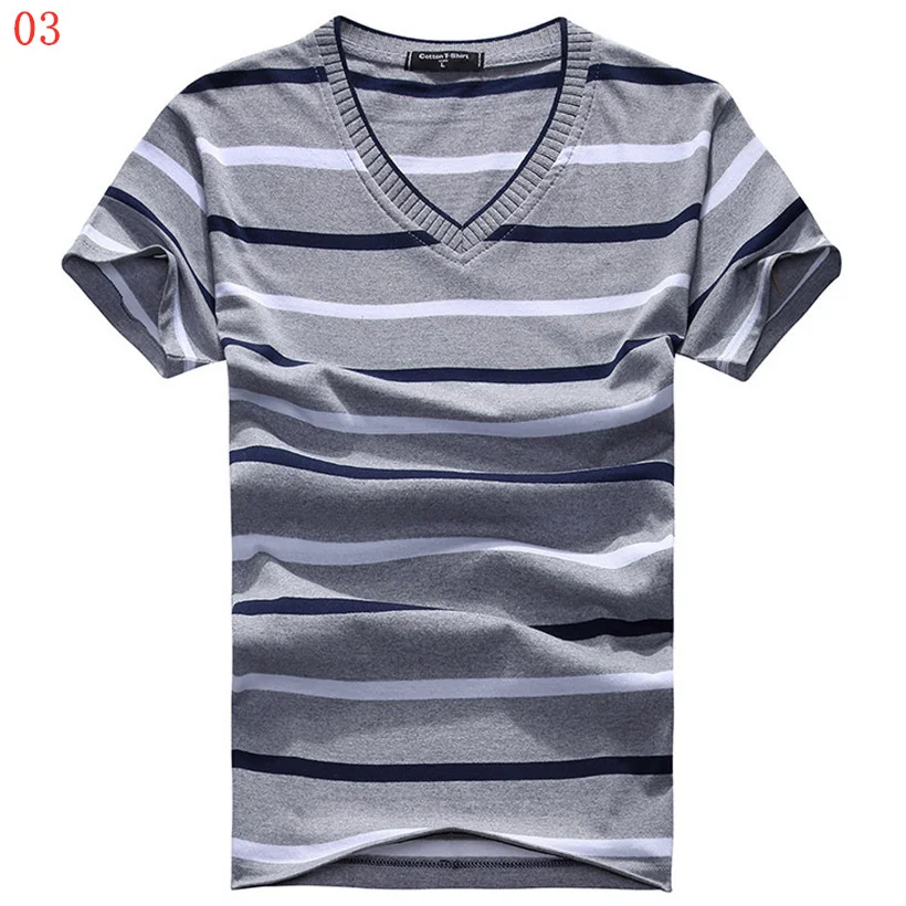 Мужская хлопковая футболка в полоску, с коротким рукавом и V-образным вырезом