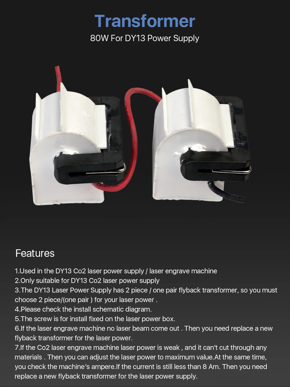2. Лазерный источник питания RECI DY13 имеет 2 шт./одну пару flyback трансформатора. Таким образом, вы должны выбрать 2 шт/(одна пара) для Вашей лазерной мощности.