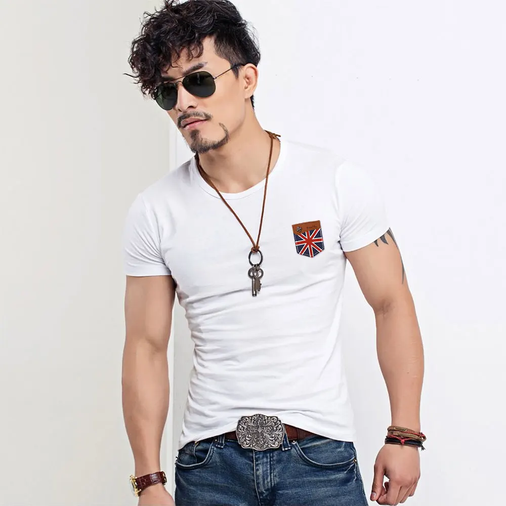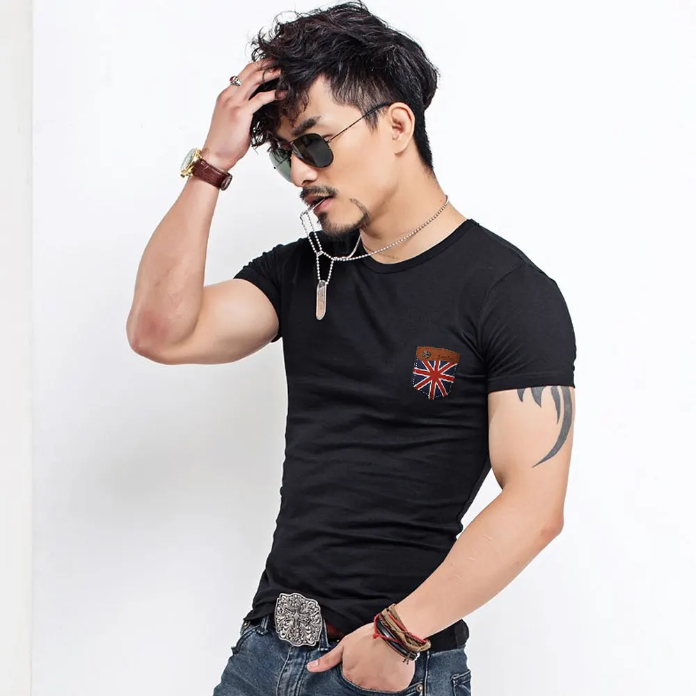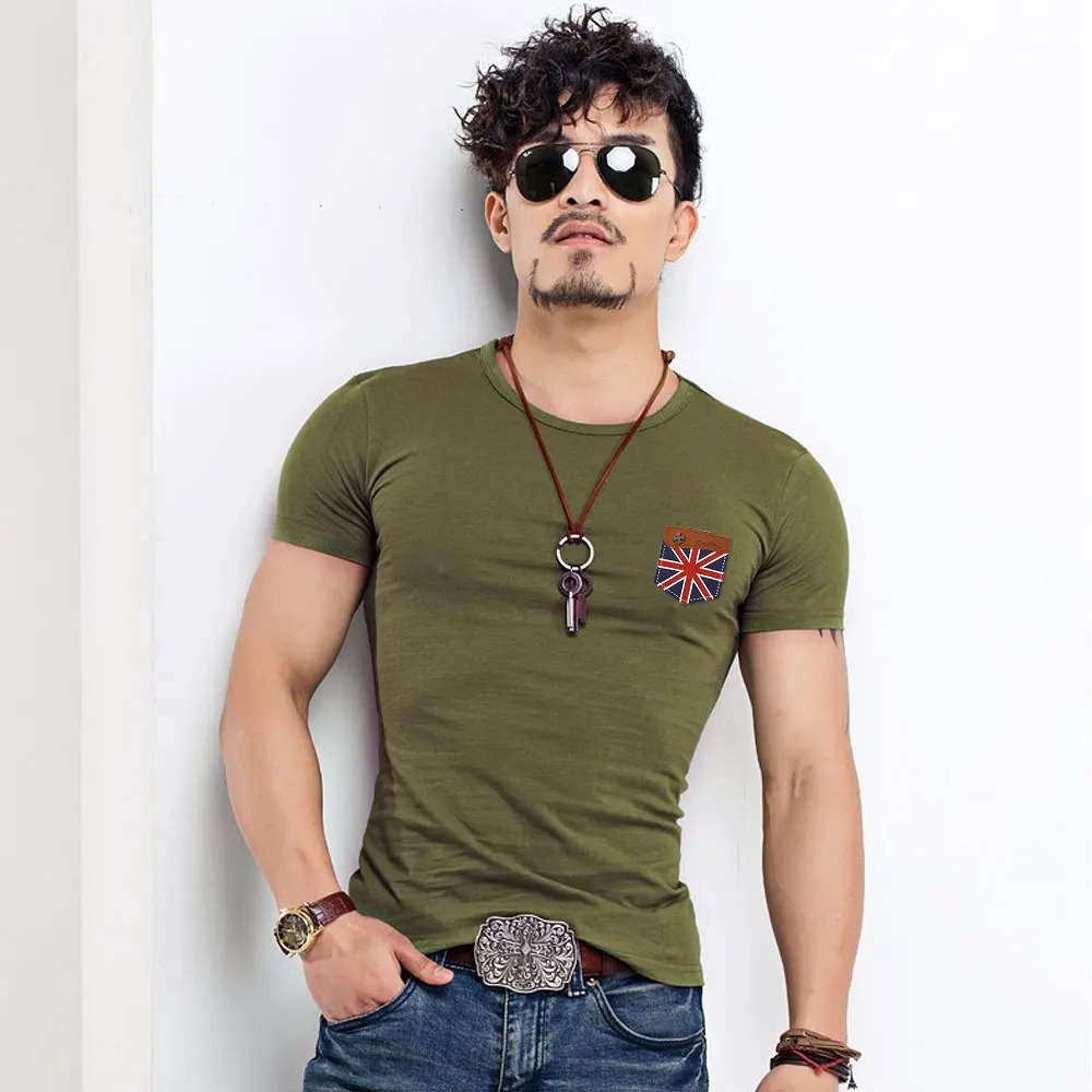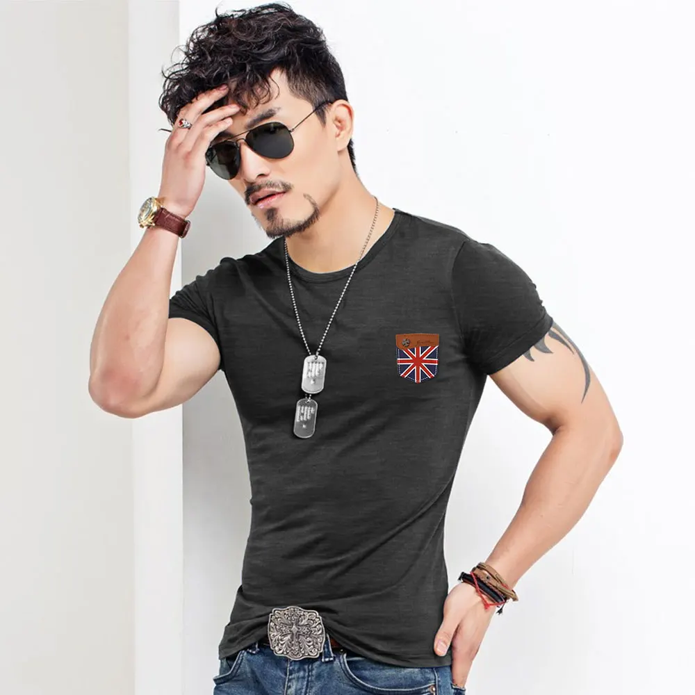 Футболка мужская с накладным карманом, дизайнерская одежда для фитнеса, кожаная рубашка с перекрестным флагом, повседневная облегающая футболка в стиле милитари, топ с круглым вырезом