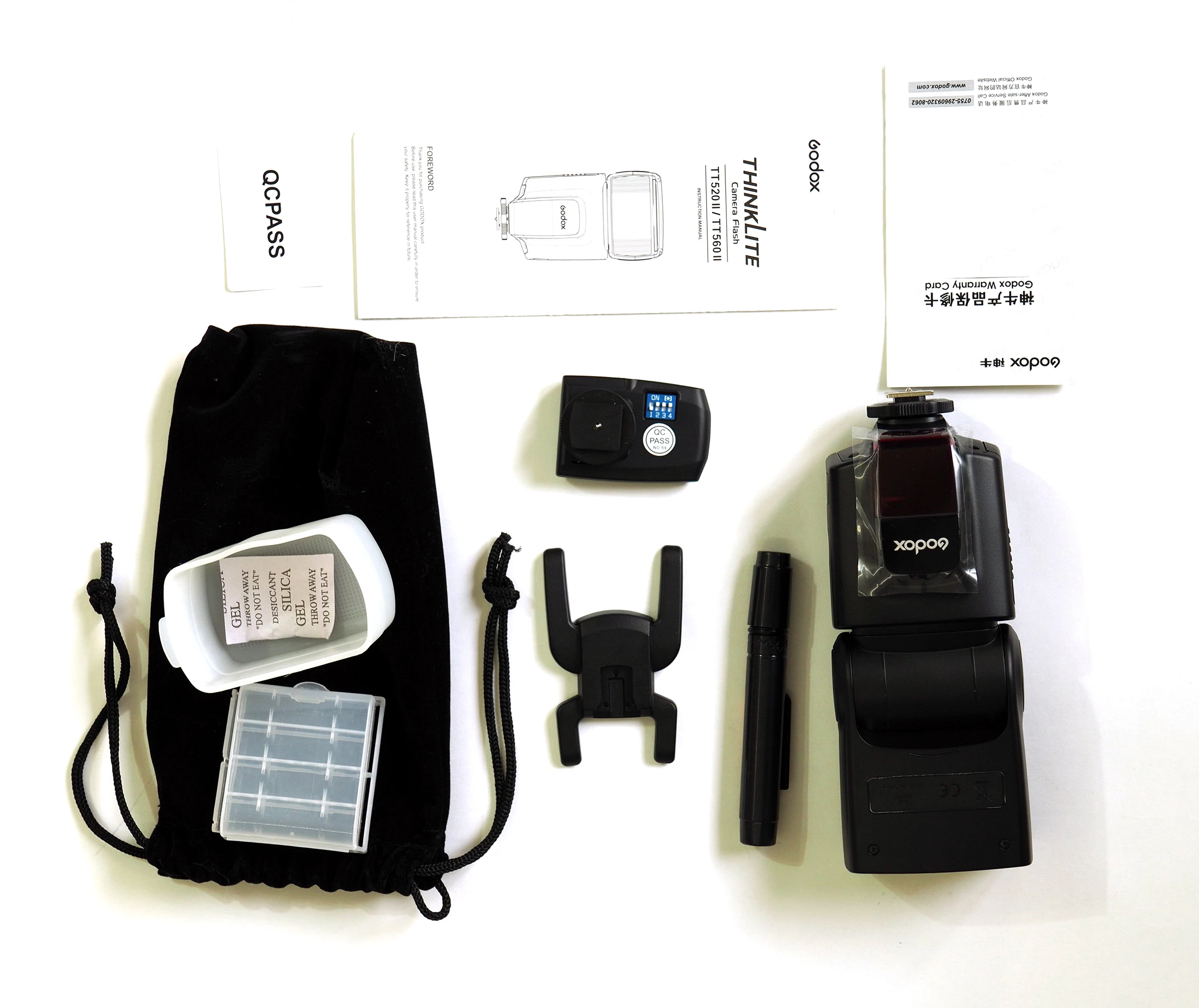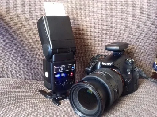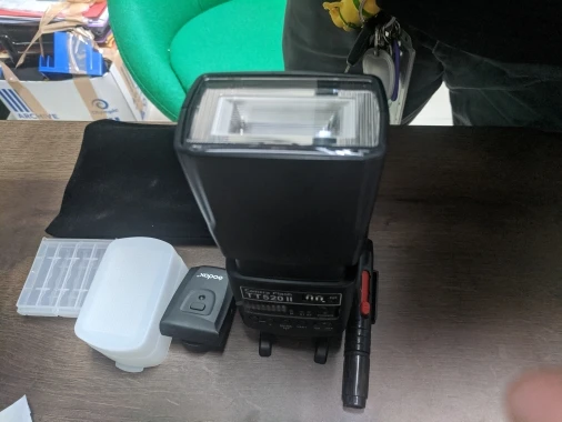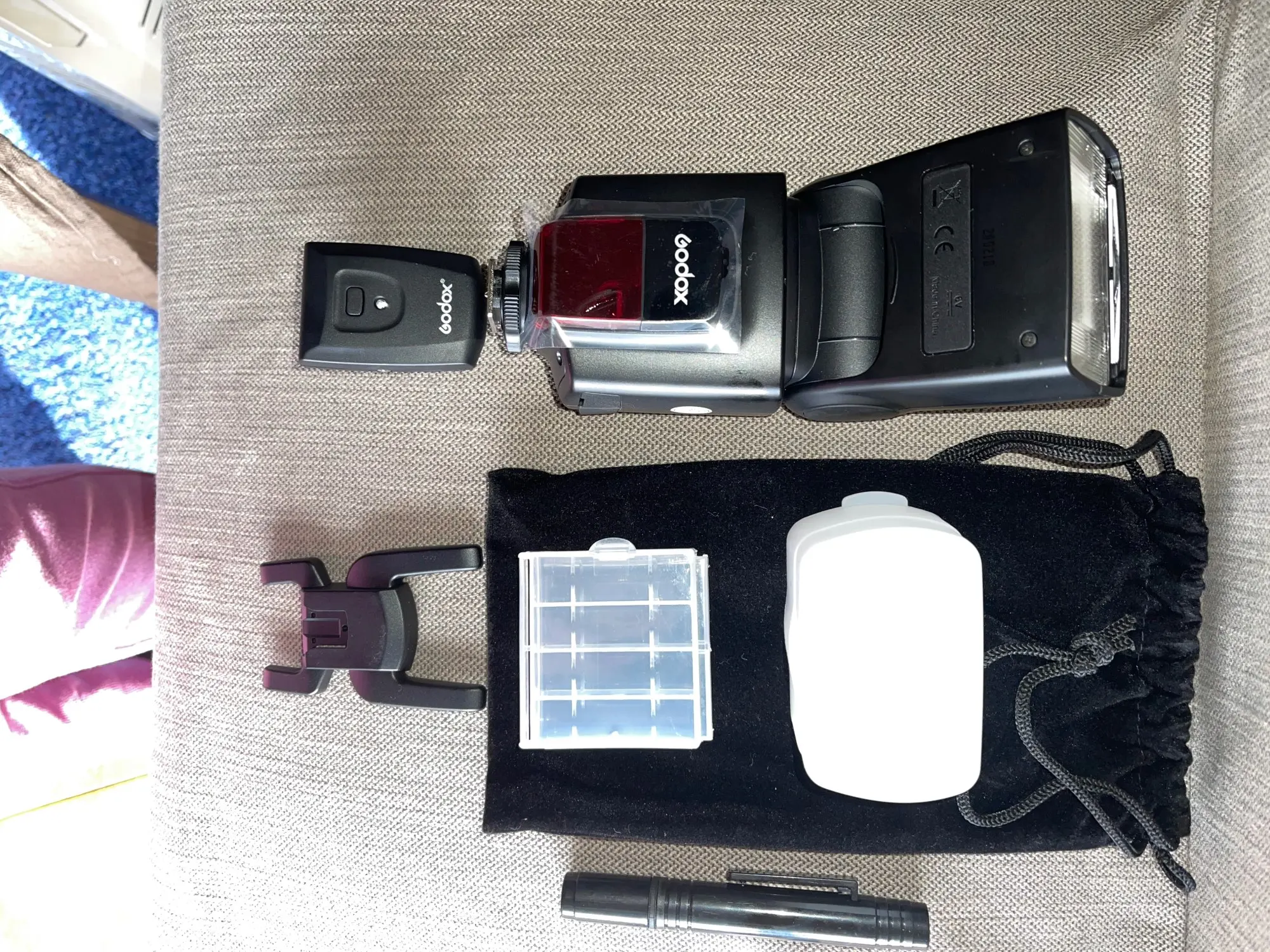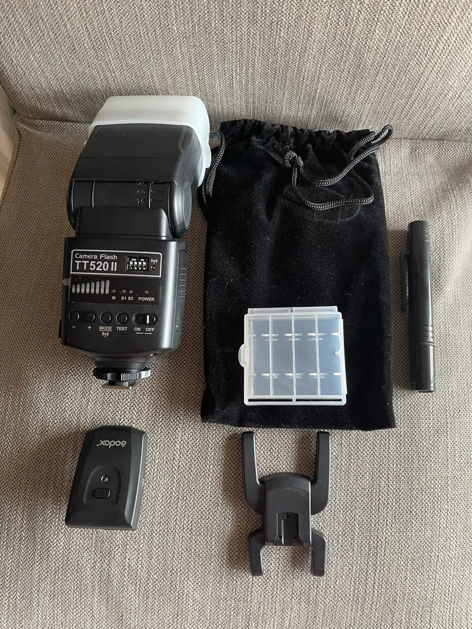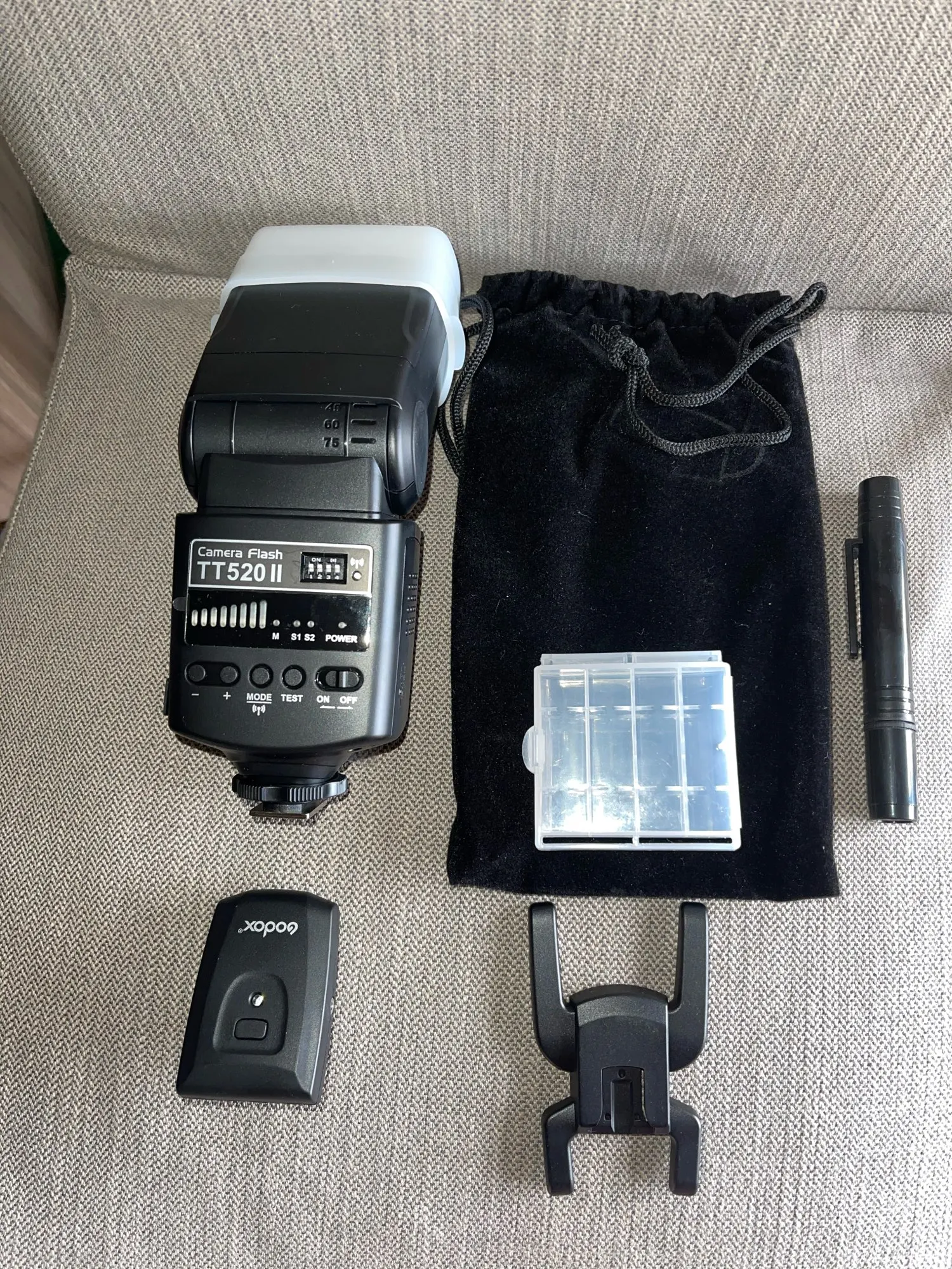 Отличная вспышка для камеры. Он изготовлен очень высокого качества и отлично работает. Батарея ror передатчик включен. В качестве бонуса была бархатная сумка, коробка для небольших вещей (таких как флеш-накопители), диффузор и карандаш для очистки.