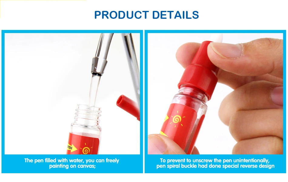 1. Встроенная губка, более мягкая и удобная. 2. Окрашенные предметы естественным образом исчезнут, их можно использовать повторно, легко использовать и носить с собой. 3. Волшебная водная щетка для рисования чистой водой. Отборный высококачественный хлопок, изготовлен из ручки высокой плотности, хорошо впитывает воду, гладкая окраска. 4. Безопасный материал. Чернила для безопасности и защиты окружающей среды, чернила для воды, нетоксичные, не загрязняющие окружающую среду, зеленые и здоровые. 5. Тщательное мастерство, прекрасные детали. Строгая технология шитья уделяет больше внимания созданию каждой детали проводки. Аккуратный процесс обрезки делает водный холст более заметным, прочным и практичным.