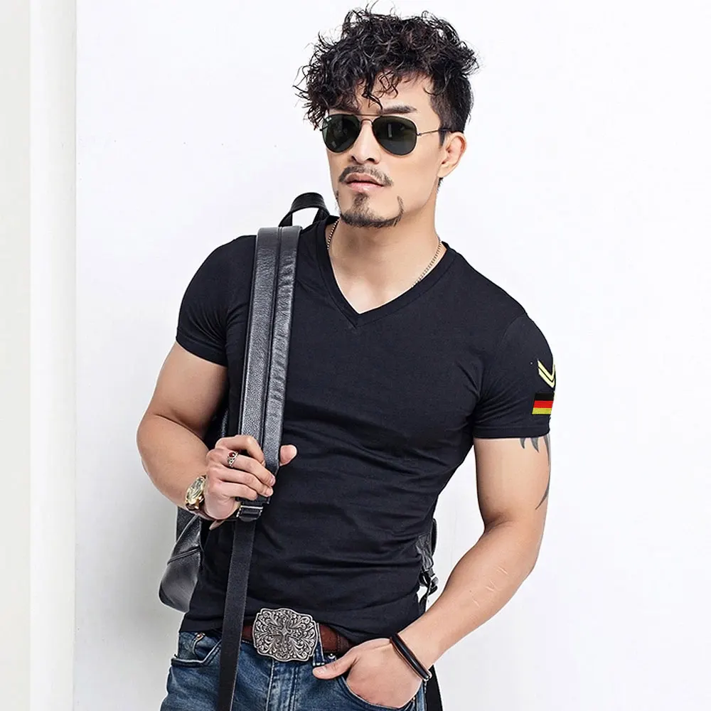 Мужская футболка в стиле милитари, модная повседневная хлопковая футболка с коротким рукавом, с V-образным вырезом, облегающая, для мужчин, от 2021 до 5XL, размера плюс