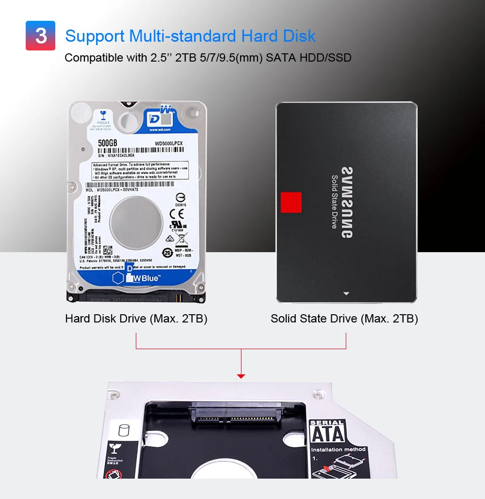 Алюминиевый переходник CHIPAL для установки второго жесткого диска, 9,5 мм, 12,7 мм, SATA 3,0, двойная светодиодная подсветка для 2,5 дюймового жесткого диска, твердотельного накопителя, чехол для ноутбука, планшетов Optibay