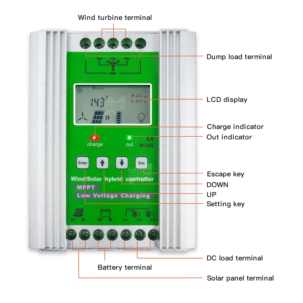 Контроллер защищает всю систему, обнаруживая напряжение батареи, зарядный ток и температуру и так далее. Когда аккумулятор достигнет плавающего напряжения заряда или высокой температуры, ветряной генератор будет сбрасывать нагрузку, независимо от того, сколько зарядный ток.