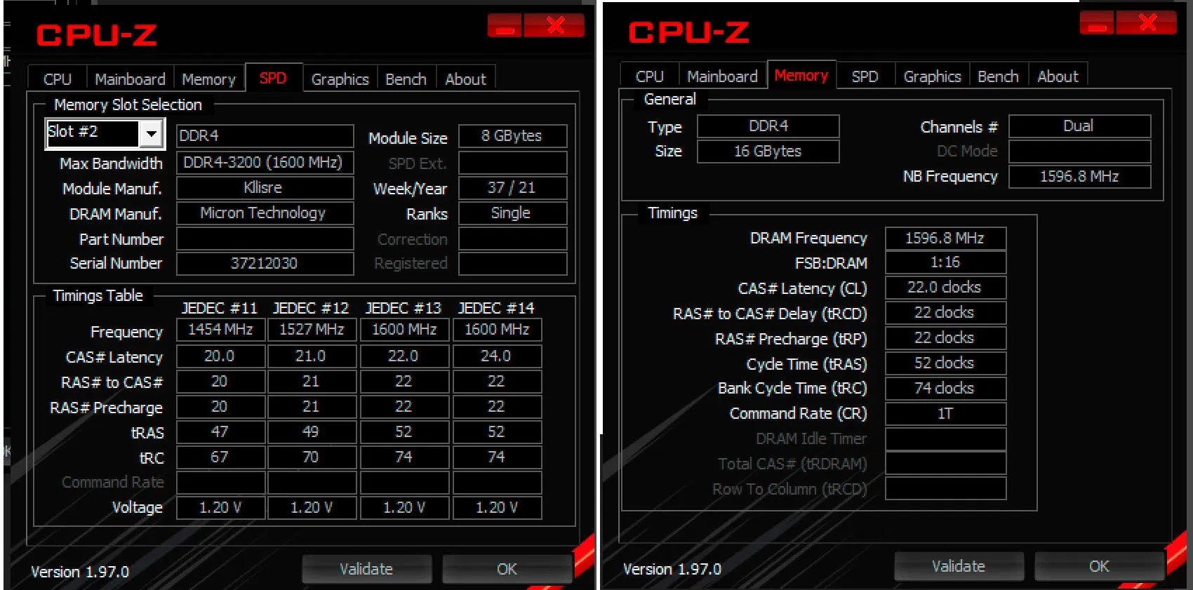 Отзыв Kllisre DDR4 8GB 3200, 4ШТ. Цена, с купоном от АЛИ по акции, по 1917руб/шт. (не дорого!)Довольно быстрая доставка. Память работает и она немного разгоняется!!! Из плюсов это все. Кто не разбирается, дальше не читайте. Далее, постараюсь по короче. Картинки многим все скажут сами за себя. Чипы вроде как микрон, фиг знает какой ревизии, производитель затер важные данные кода. (может инженерка, может отбраковка, все может быть..) В базовых настройках память ужасная, если не гнать, то это ручник для всего компа. тайминги конские. Повышение напряжения переносит плохо, ограничивает разгон. С разгоном, см. картинки, становится лучше и более менее сносно. 3800 не берет ни под каким соусом, даже одна плашка. 3733 край и не стабильно. Стабильная частота, первичные тайминги и вольтаж на картинке. - Если у вас нету хорошей видеокарты(RTX 3070 и выше), то этой памяти будет достаточно (с разгоном) Хотелось бы видеть подобные отзывы, до покупки кота в мешке.