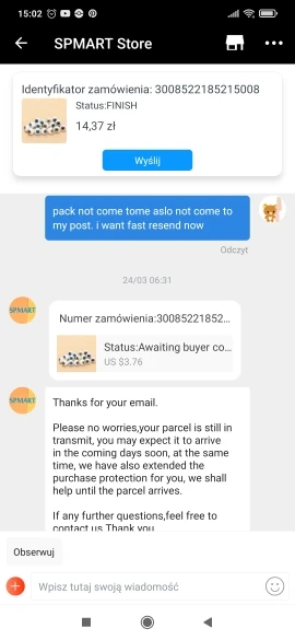 Я не знаю, в чем проблема, но она не пришла, и они отменили мой заказ