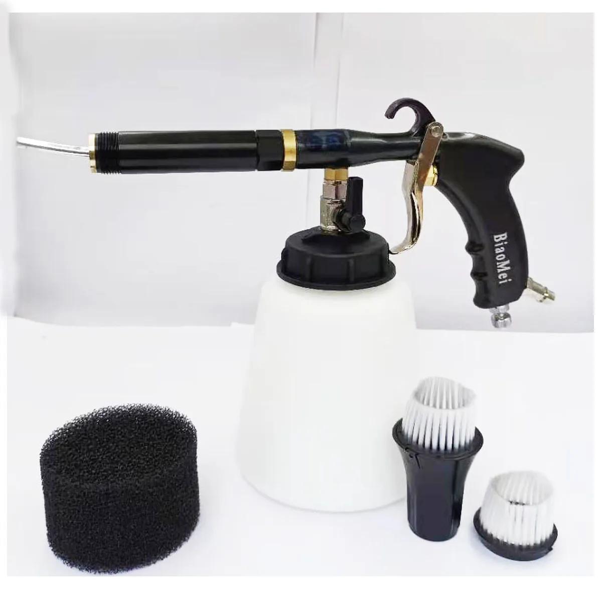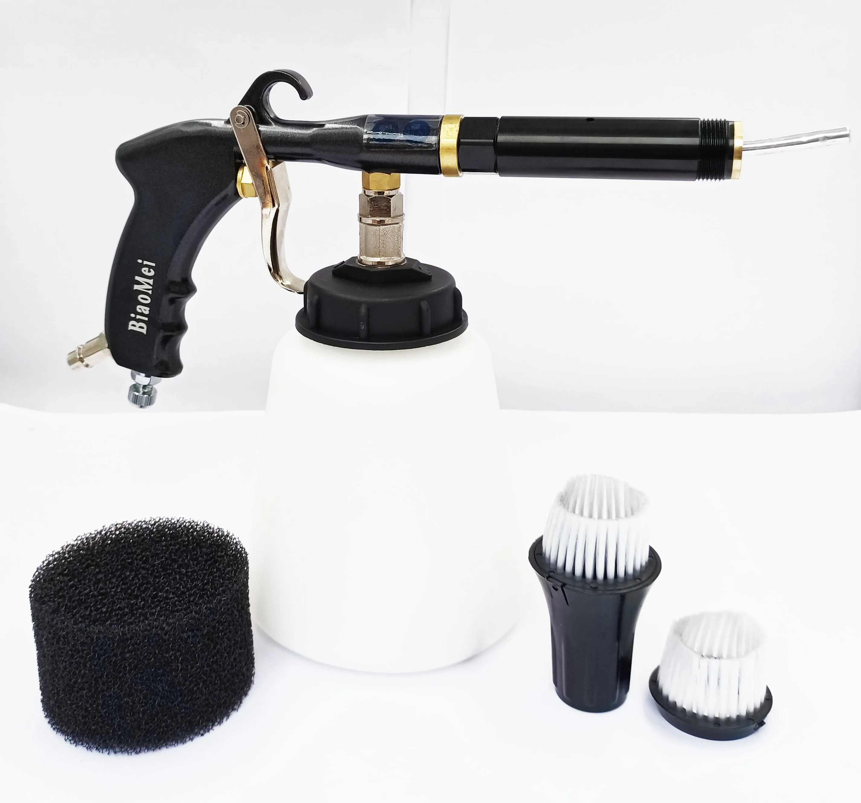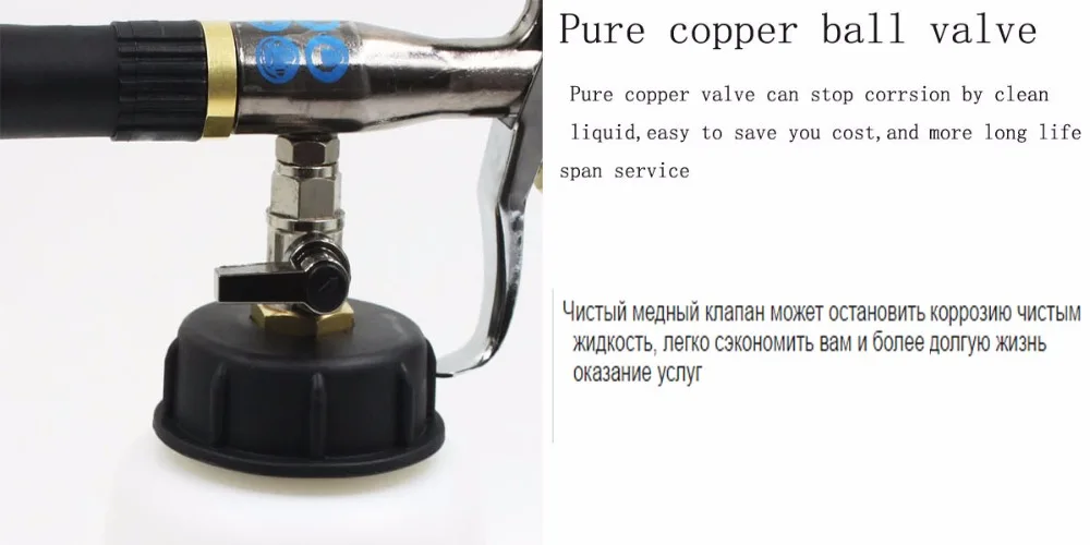 Машина подключена к воздушному компрессору, и она вращается на своей оси на высокой скорости внутри очистительного пистолета трубы круглой трубы воздушного компрессора 0,4-0.9Mpa (58-130PSI) (Оптимальное рабочее давление составляет 0,7мпа, оно не должно превышать 1 МПа). Очищающая жидкость генерирует эффект распыления под сильной центробежной силой, генерируемой высокоскоростным вращением круговой трубы. Распыленная очищающая жидкость прикрепляется к пятну и делает пятна полностью отделенными от поверхности детали. В то же время, привлекают радикальные частицы на трубных насадках для эффективного удаления пятен; Он также может стерилизовать бактерии в автомобиле.