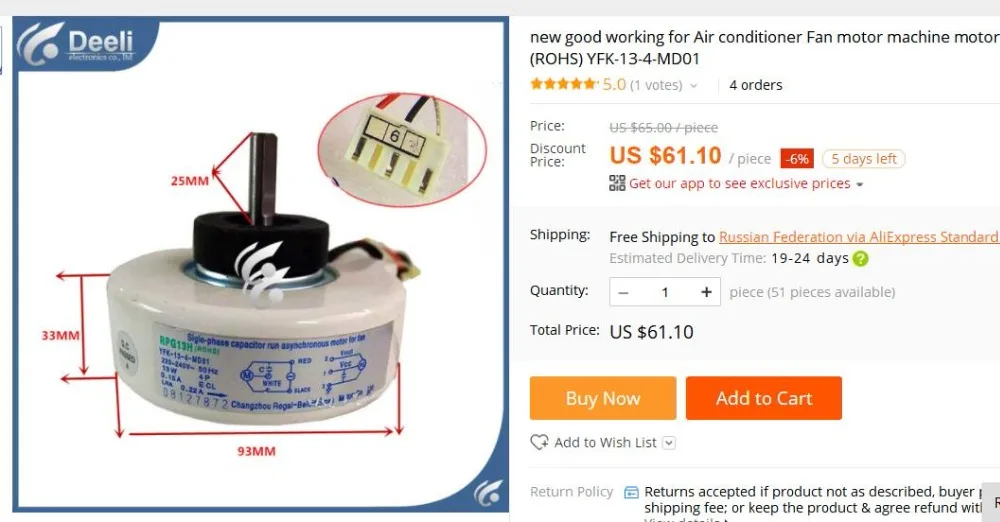 Двигатель для вентилятора для кондиционера RPG13F, RPG13C, RPG13H (ROHS) YFK-13-4-MD01