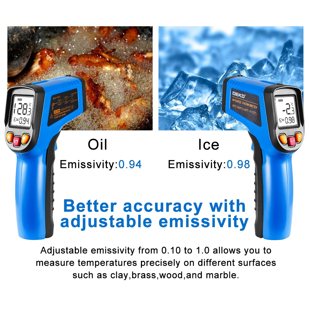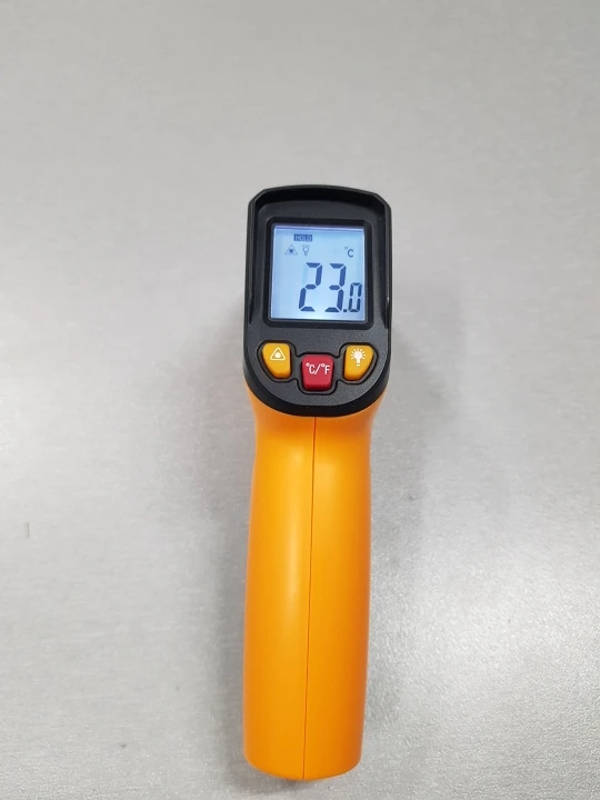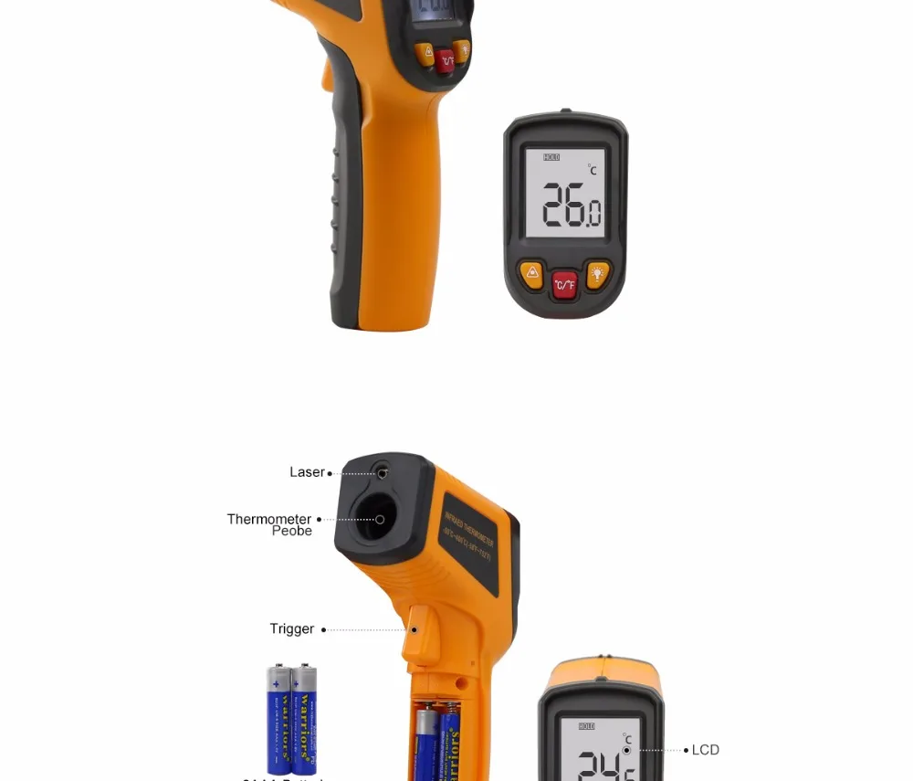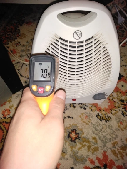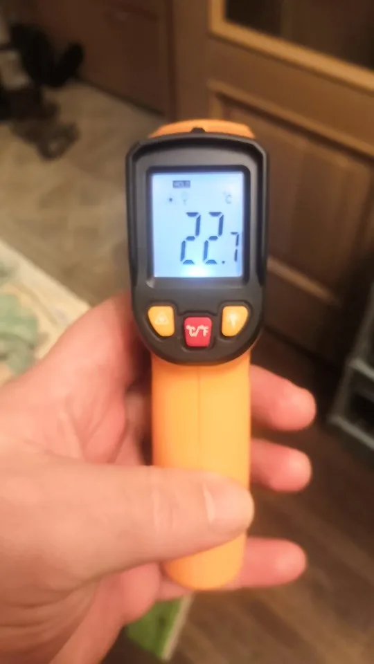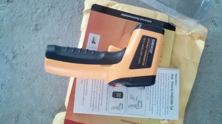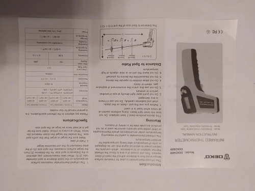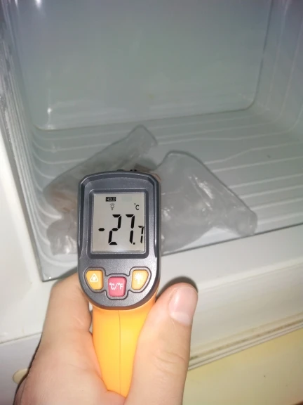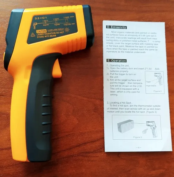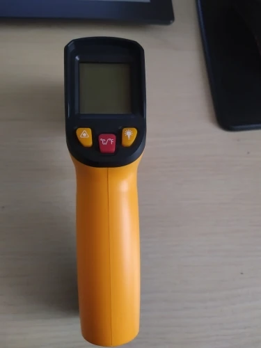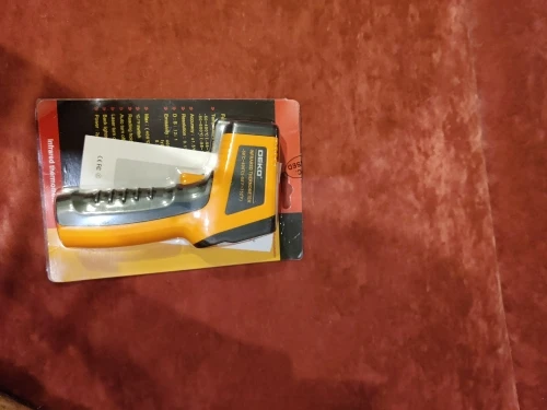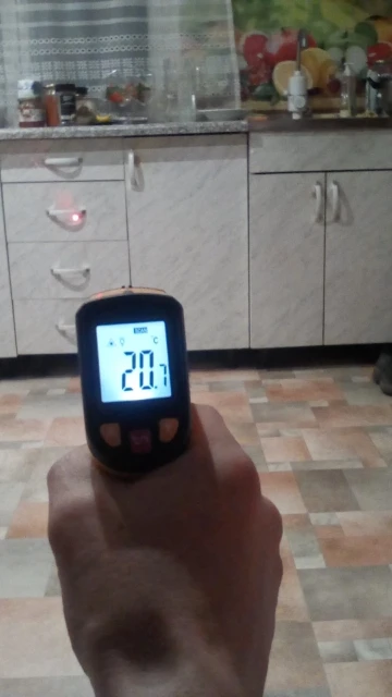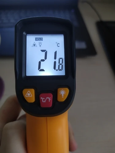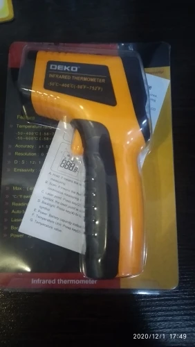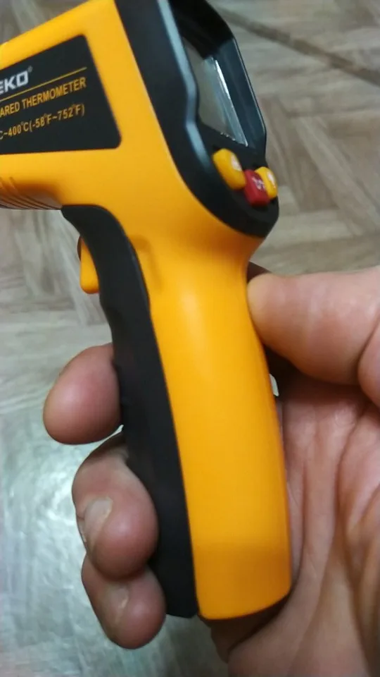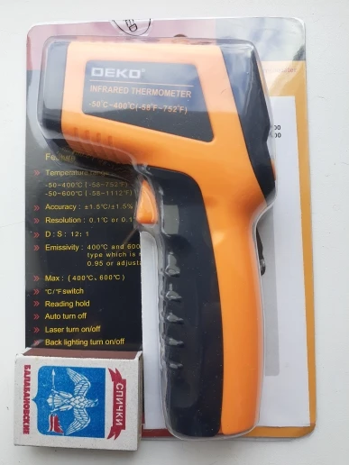 Огорчён. Лазерный указатель места замера температуры сбит вверх и влево, на расстоянии 2 метра на 5-8 см в сторону реальной точки замера температуры показывает! ((( Приходится целится по мушке, как пистолетом. Покупал для контроля температуры подшипников, в итоге пользоваться очень не удобно. А так точность +- 2-3С (в сравнении с точными откалиброванными термометрами). В остальном за цену со скидкой нормально, пойдёт. Доставку считаю быстрой, до центра России менее 2 недель.