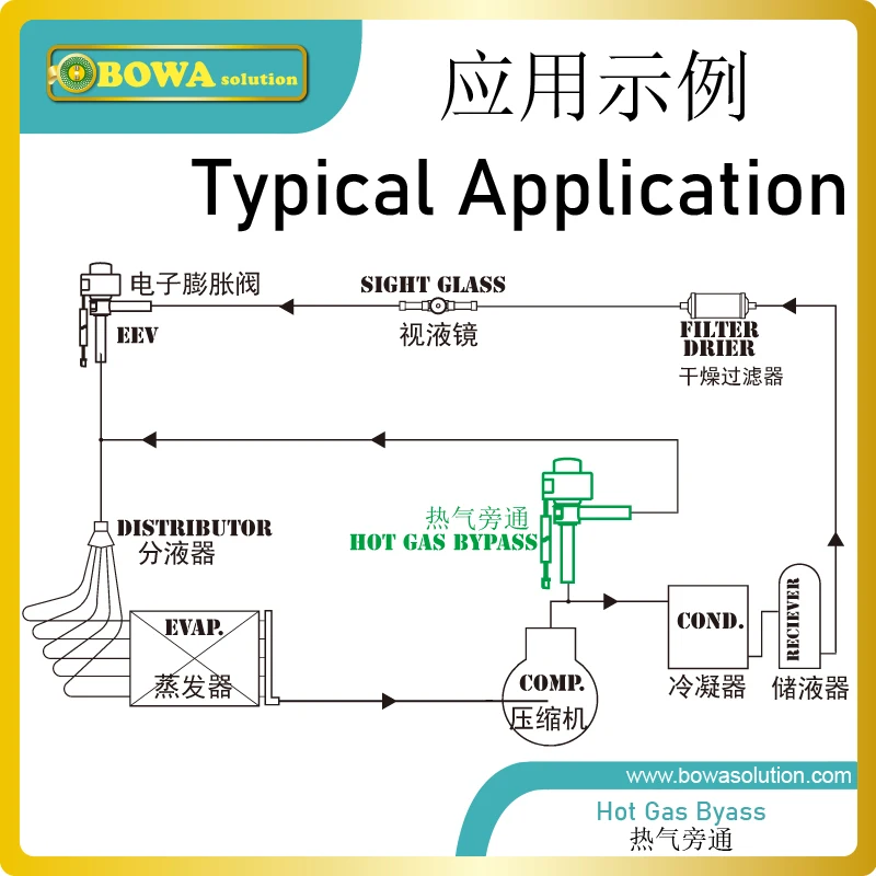 Установленная в байпасе между высокими и низкими сторонами системы осушителя воздуха, она поддерживает давление всасывания компрессора Путем впрыскивания горячего газа/прохладного газа со стороны высокого давления.