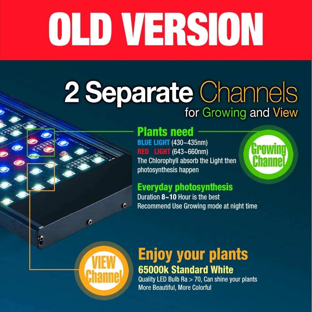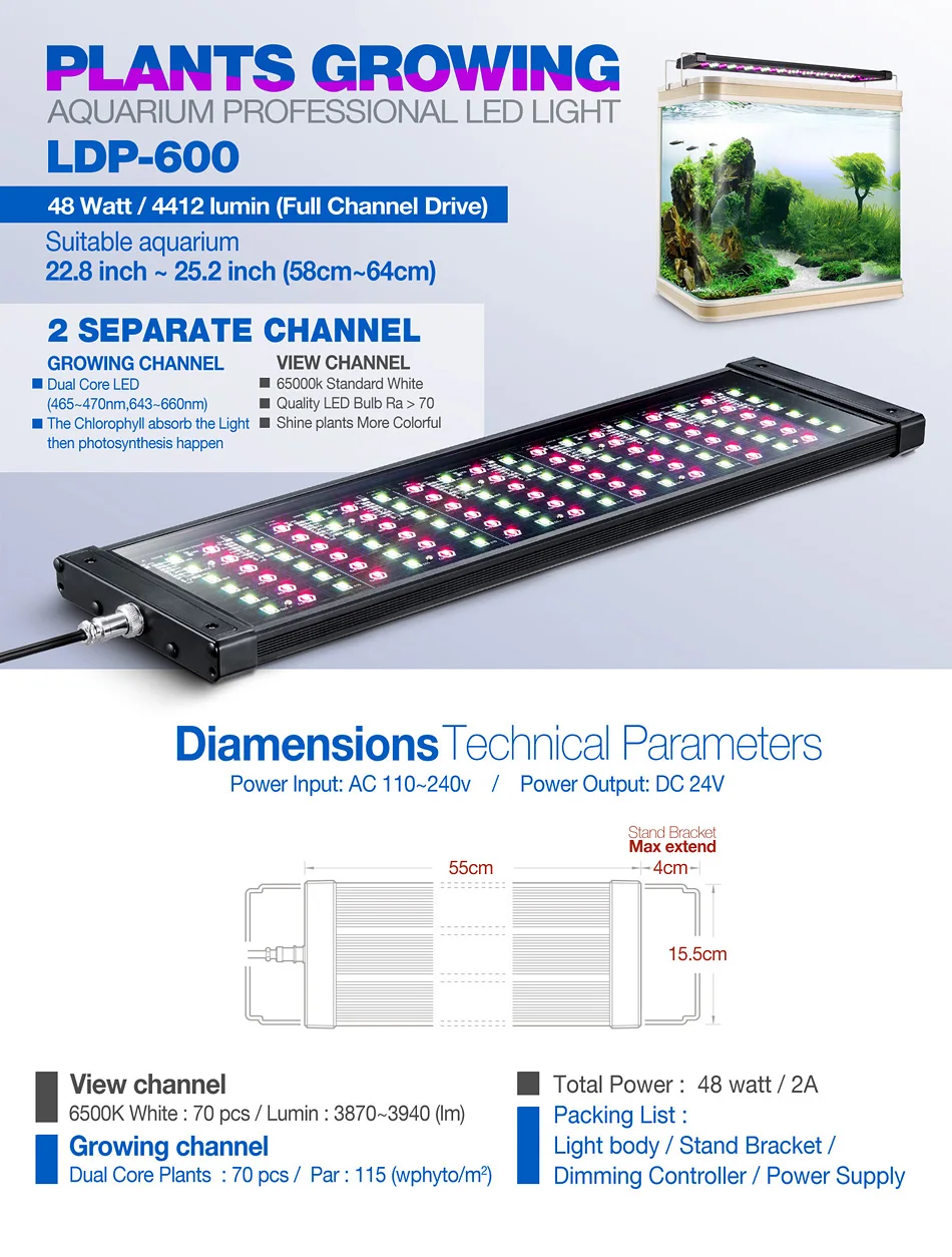 Аквариумный растительный светильник LDP-600Встроенный 2 светильник канала, 6500k держатель серии standard с белыми фиксаторами на просмотра каналов и Выращивание растений канал