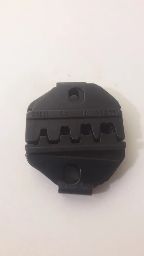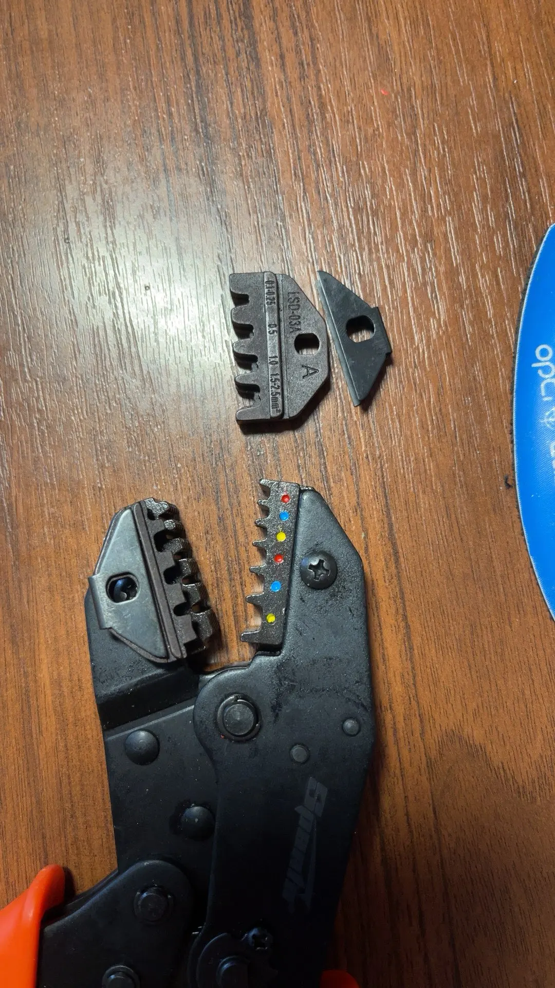Матрица с проставками (хотя непонятно зачем, если к родному инструменту). Из около десятка купленных на тест для обжатия клемничков по факту нормально обжала только два. Может быть это толщина металла клемников, может быть рука не набита. Еще есть некая путаница с размерами, потому как на клемниках ничего не пишется и оказывается нужно их вставлять в меньший, чем кажется паз матрицы. Вызвала смешанные чувства в общем. Та часть, что цепляется за оболочку провода, как правило выходит хорошо, чего не скажешь об обжиме самих жил.