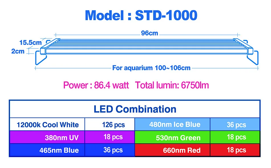 Холодный белый Светодиодный 12000k : 126 шт.Синий 465 нм: 36 шт.Ледяной синий 480 нм: 36 шт.УФ 380 нм: 18 шт.Зеленый 530 нм: 18 шт.Красный 660 нм: 18 шт.