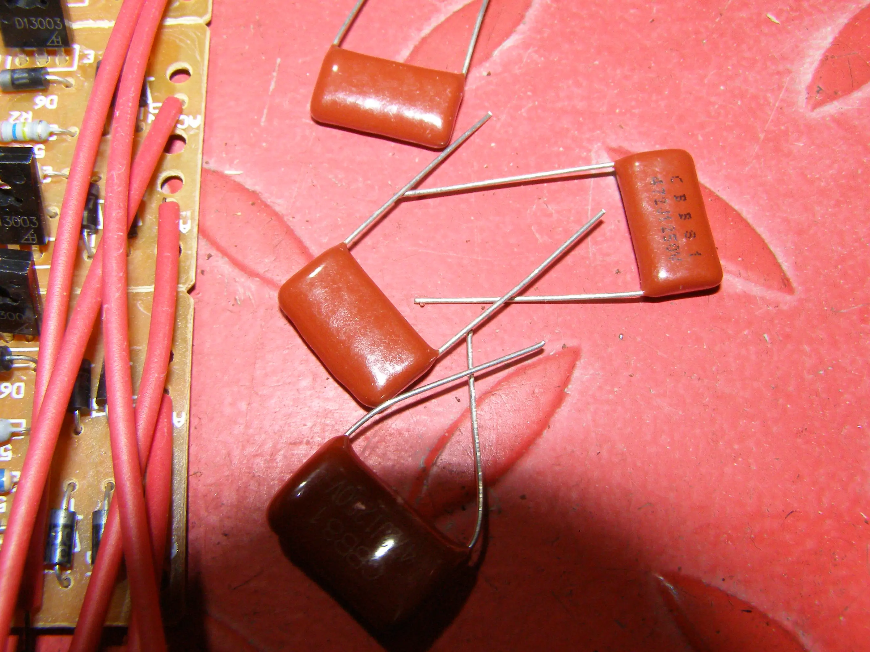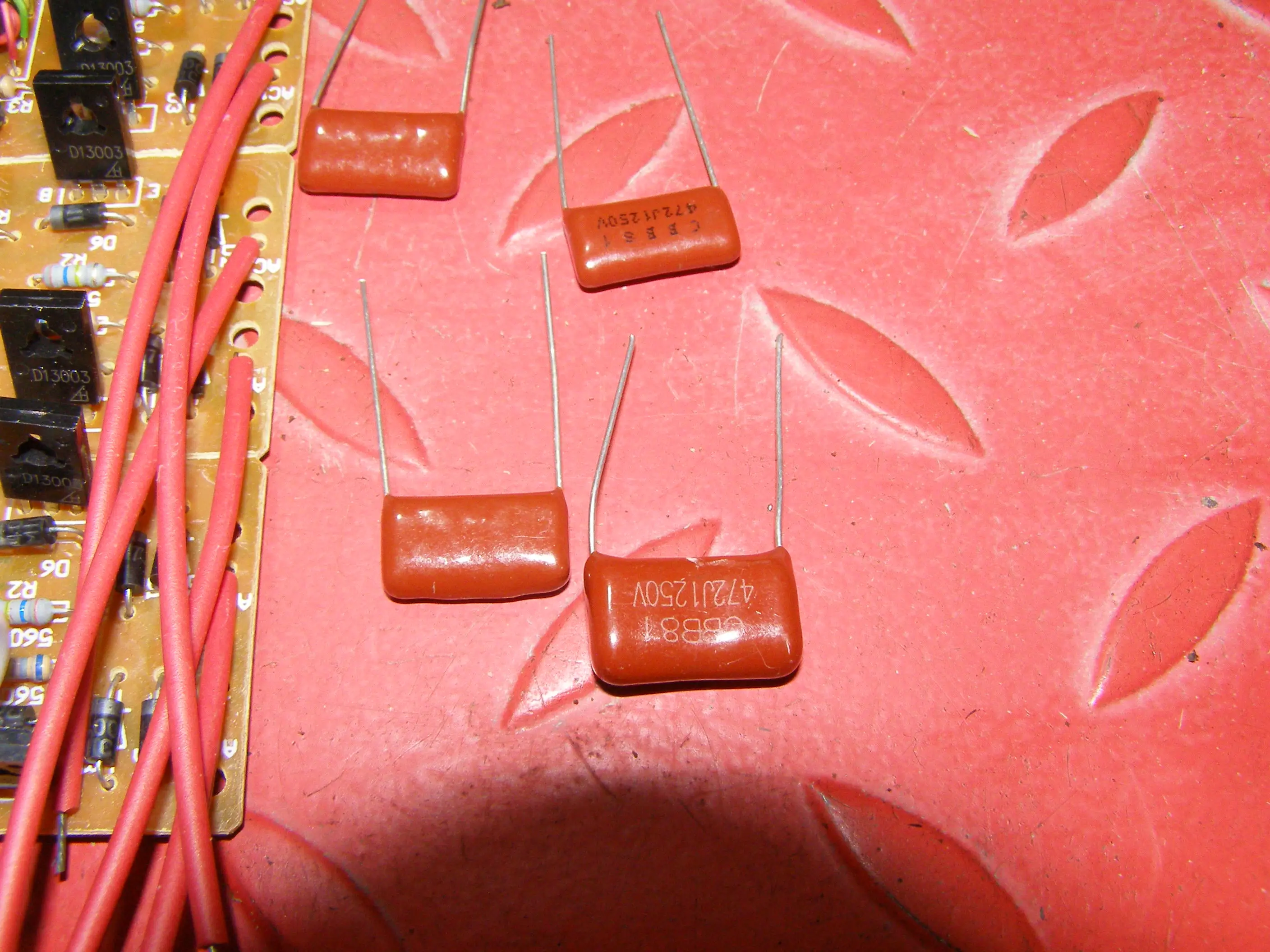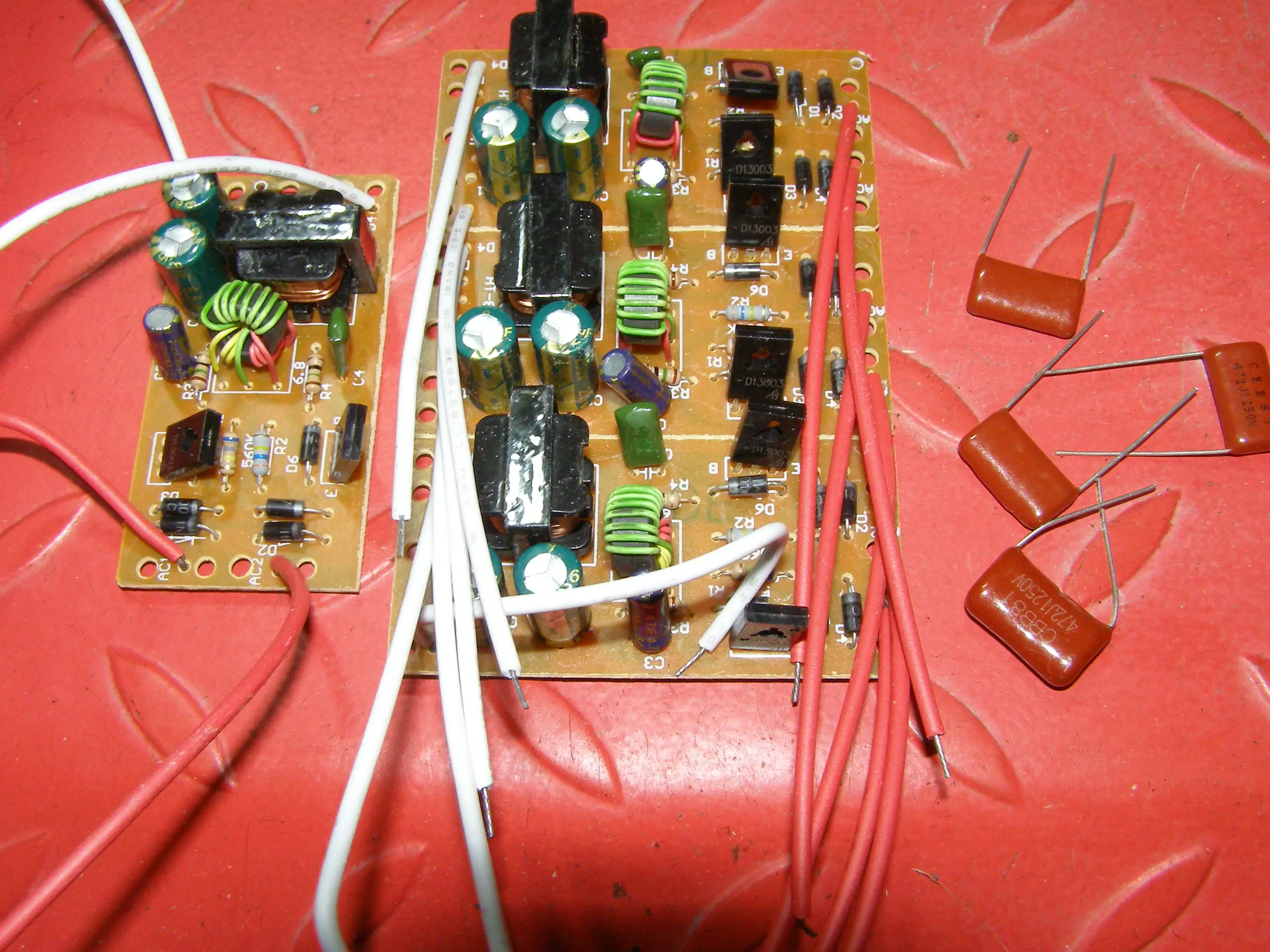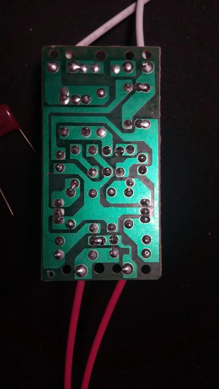 Заменил плату, но старые лампы также плохо зажигаются. Зато со сгоревшими спиралями зажигается без морганий. Срезал торец и вынул из одно лампы стартёр вместе с конденсатором, перестала зажигаться совсем. Подключил только конденсатор и всё заработало. У другой лампы просто перекусил вывод от стартёра. Залил немного термоклеем, можно герметиком, для безопасности. Надо было сразу доработать лампу и не покупать плату.