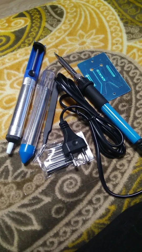Паяльник с регулировкой температуры-1 шт.5 шт. наконечник паяльника1 x подставка для пайки1 пинцет1 x паяльная проволока1 х насос для демонтажа