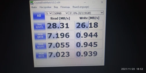 Заказал 11 числа, получил 15. Эффективный объем 119Гб, скорость чтения 93.69 МБ/сек, записи - 63.75 в целом нормально