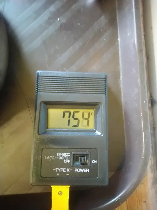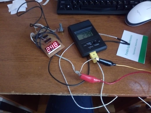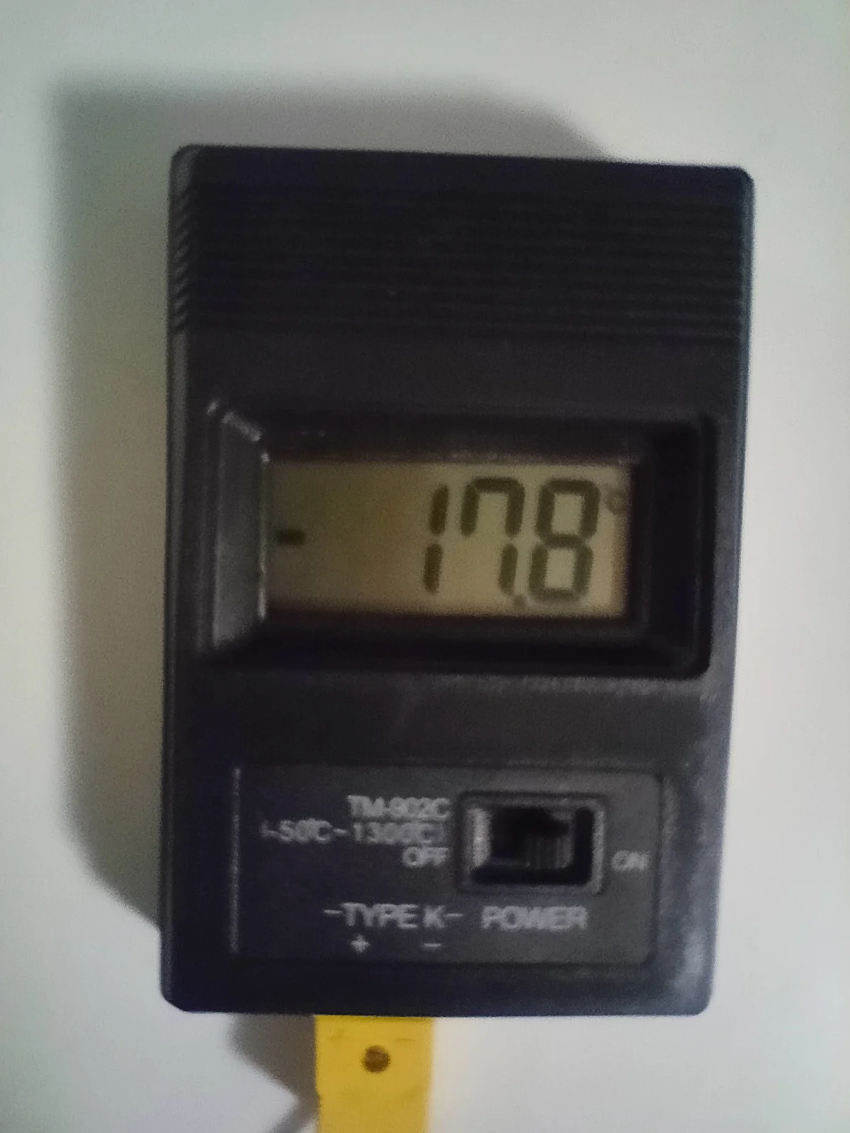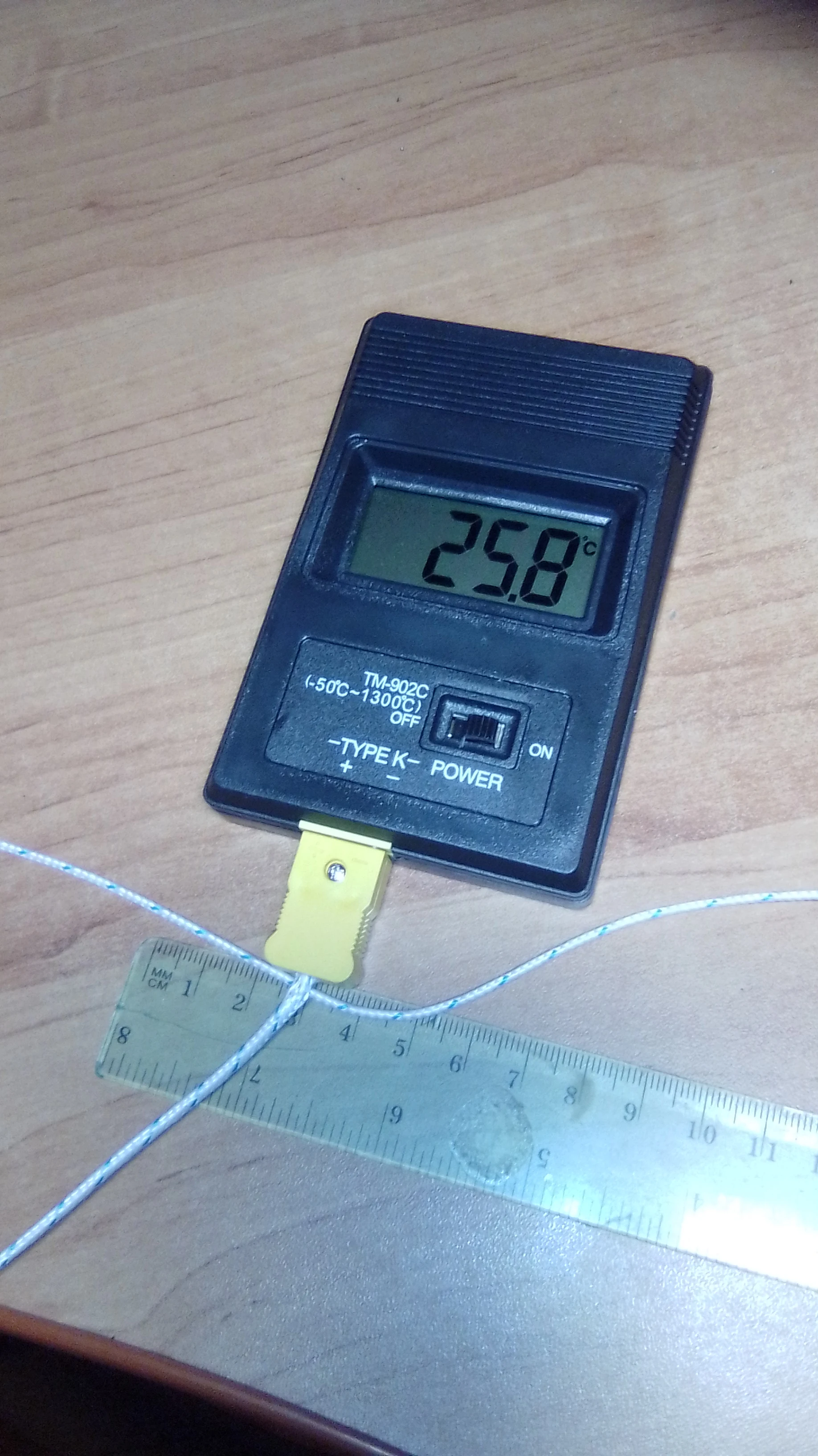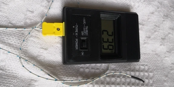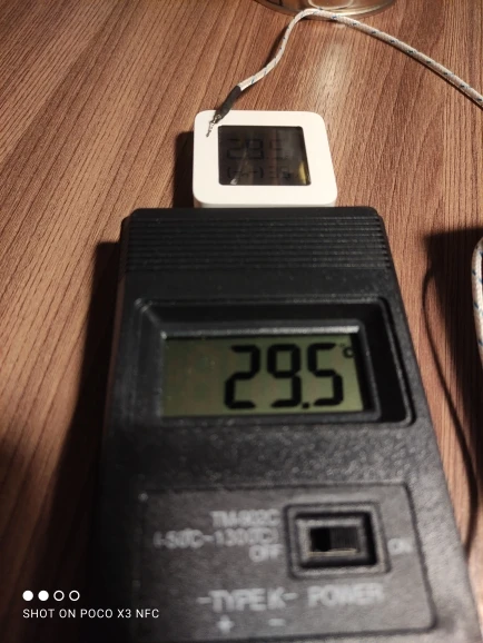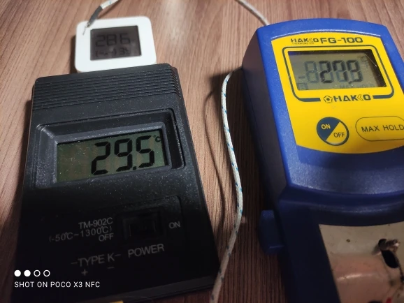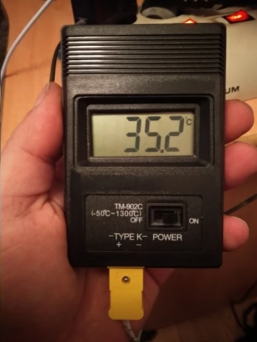 Термометр показывает одинаковую температуру с часами, имеющими встроенный термометр. Температура кипящей (буквально, клокочущей) воды - 101,9-102,0°C. Самая чувствительная точка термопары оказалась не на кончике, где должен находиться спай проводников, а чуть выше, миллиметрах в трех. Проверил температуру фена Лукей 702 - вместо уставки 328°C термометр показал 368-370°C (как я и думал, паялка врет. Короче, для не очень ответственных замеров вполне пригоден. Да, термометр и вправду работает от 3 вольт! Я использовал для пробы свежую и несвежую батареи. С обеими батареями термометр работает. Рекомендую!