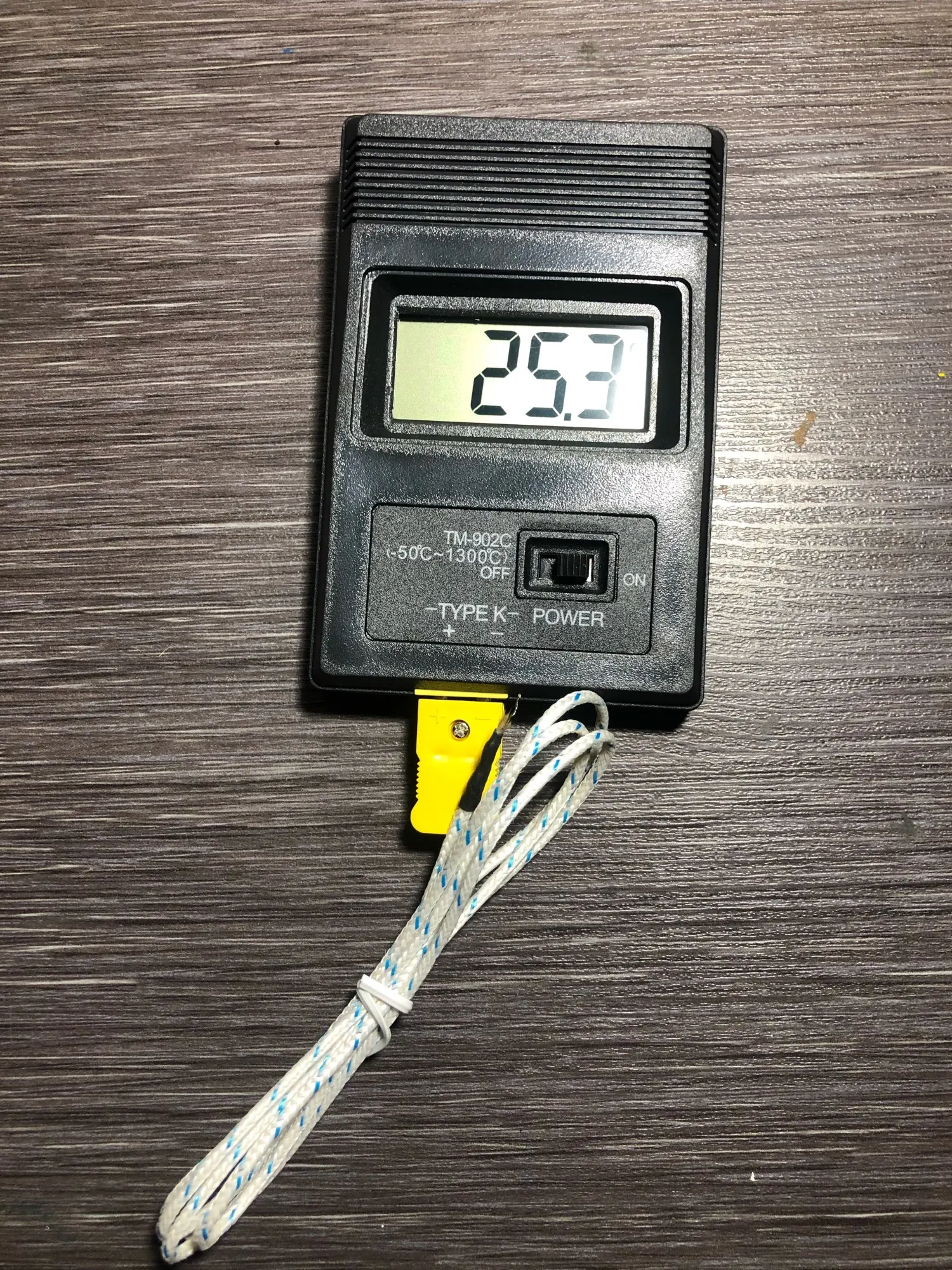 Температуру измеряет. Провода в штекере термопары не пропаяны. Доставка быстрая.