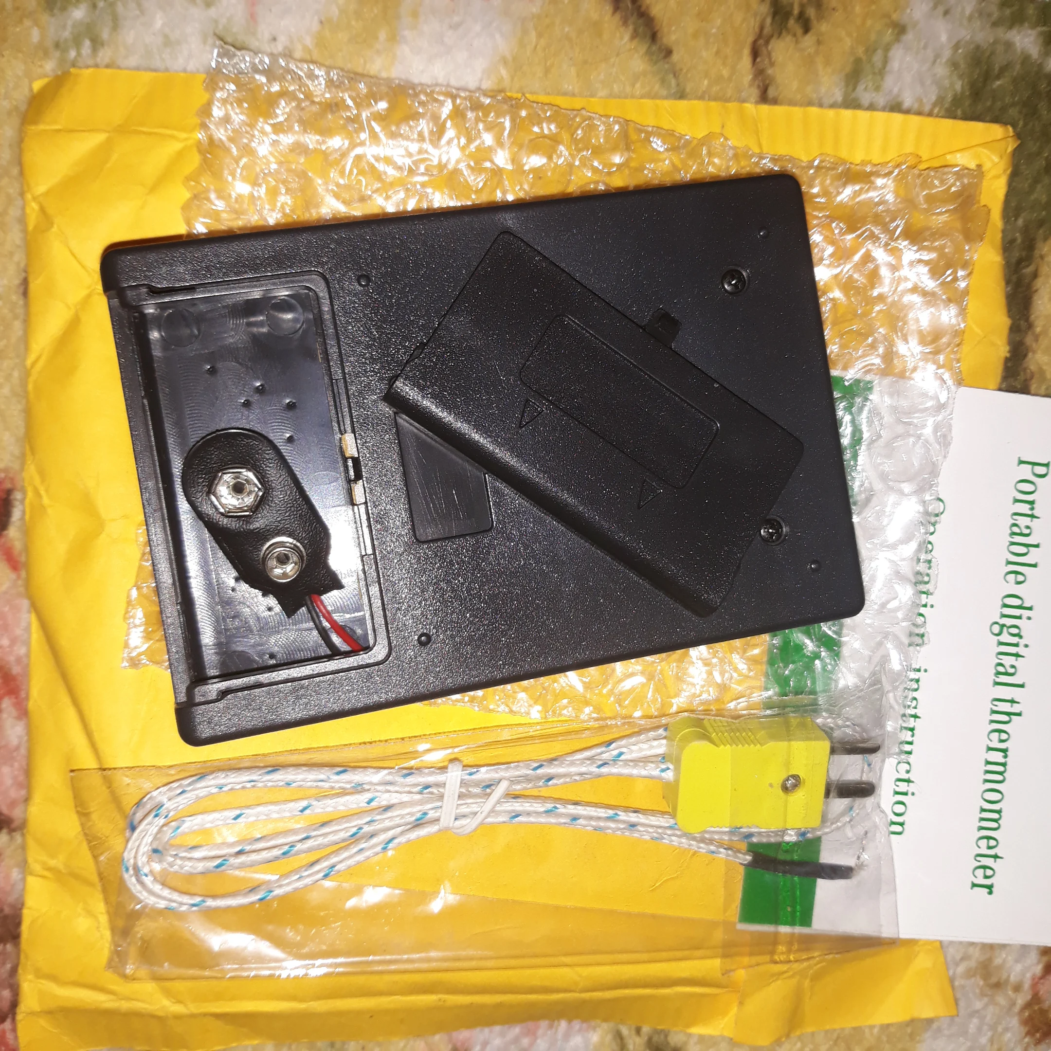 Пришло быстро, в комплекте датчик и термопара. Реагирует на изменение температуры быстро, продуктом доволен. Из недостатков - тесный отсек для батареи, трудно её туда запихать, не повредив разъем. Оплетка провода может разлохматиться, что так-же минус, снижающий удобство, качество термопары тоже не очень, но за такую цену - почему бы и нет? Дешевый датчик для мастерской, который не жалко, рекомендую.